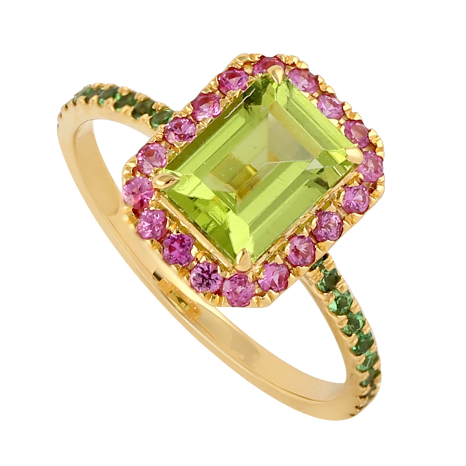 Baguette Cut Peridot Pink Sapphire Pave Tsavorite Gemstone Solitaire Ring In Gold