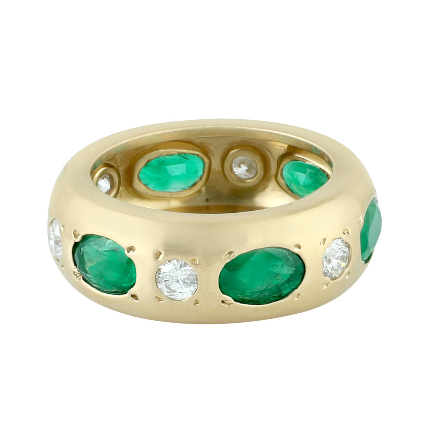 Oval Cut Emerald Gemstone Bezel Diamond Band Ring In Yellow Gold