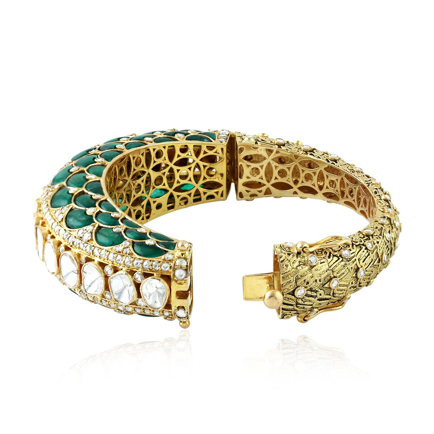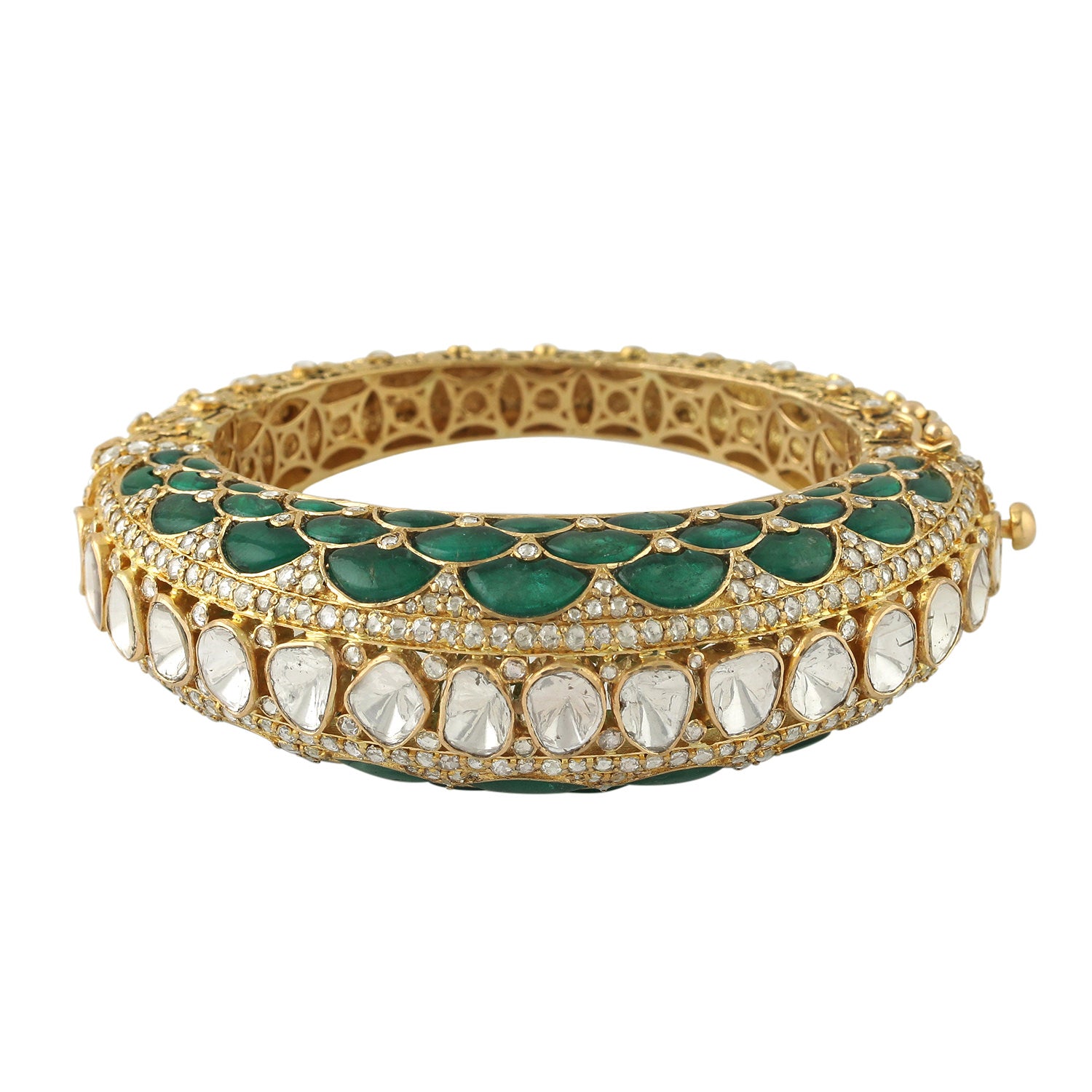 Uncut Diamond Bezel Emerald Gemstone Wedding Bangle In 22K Yellow Gold