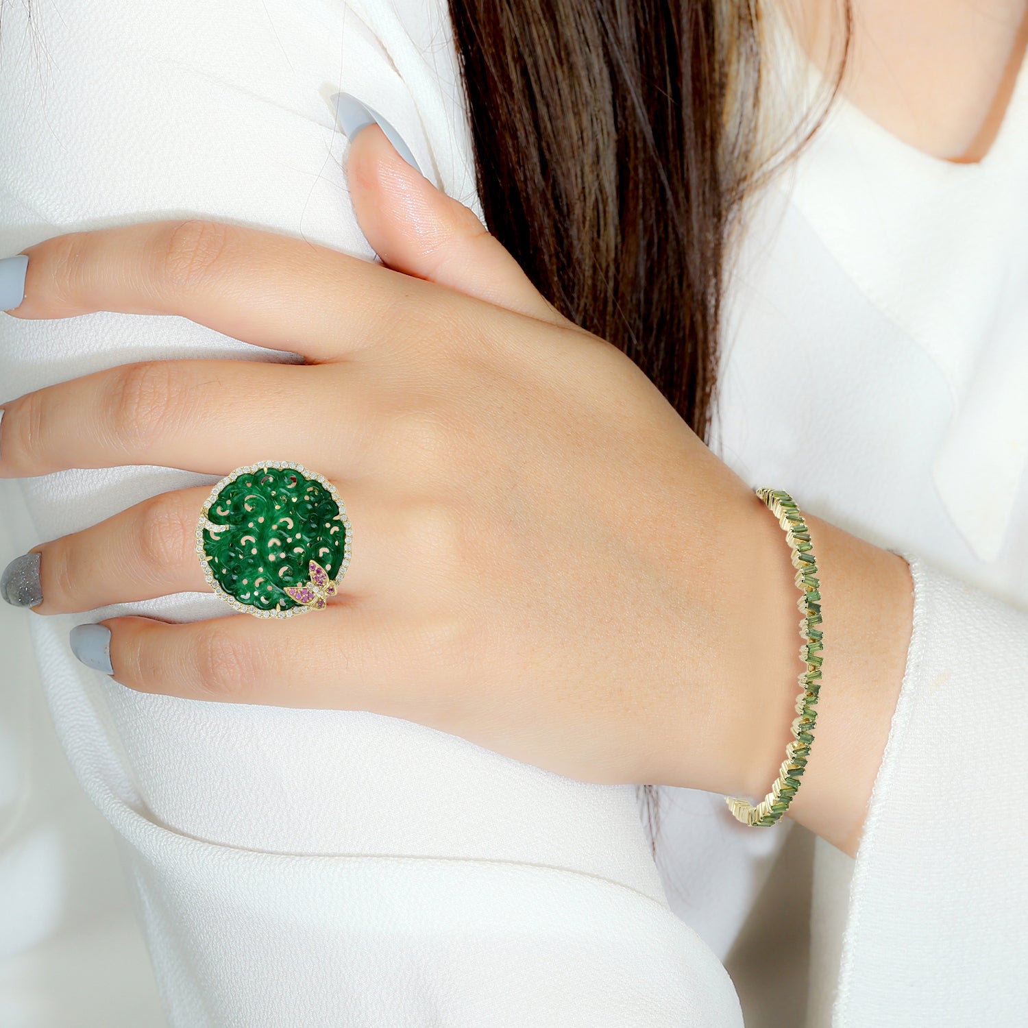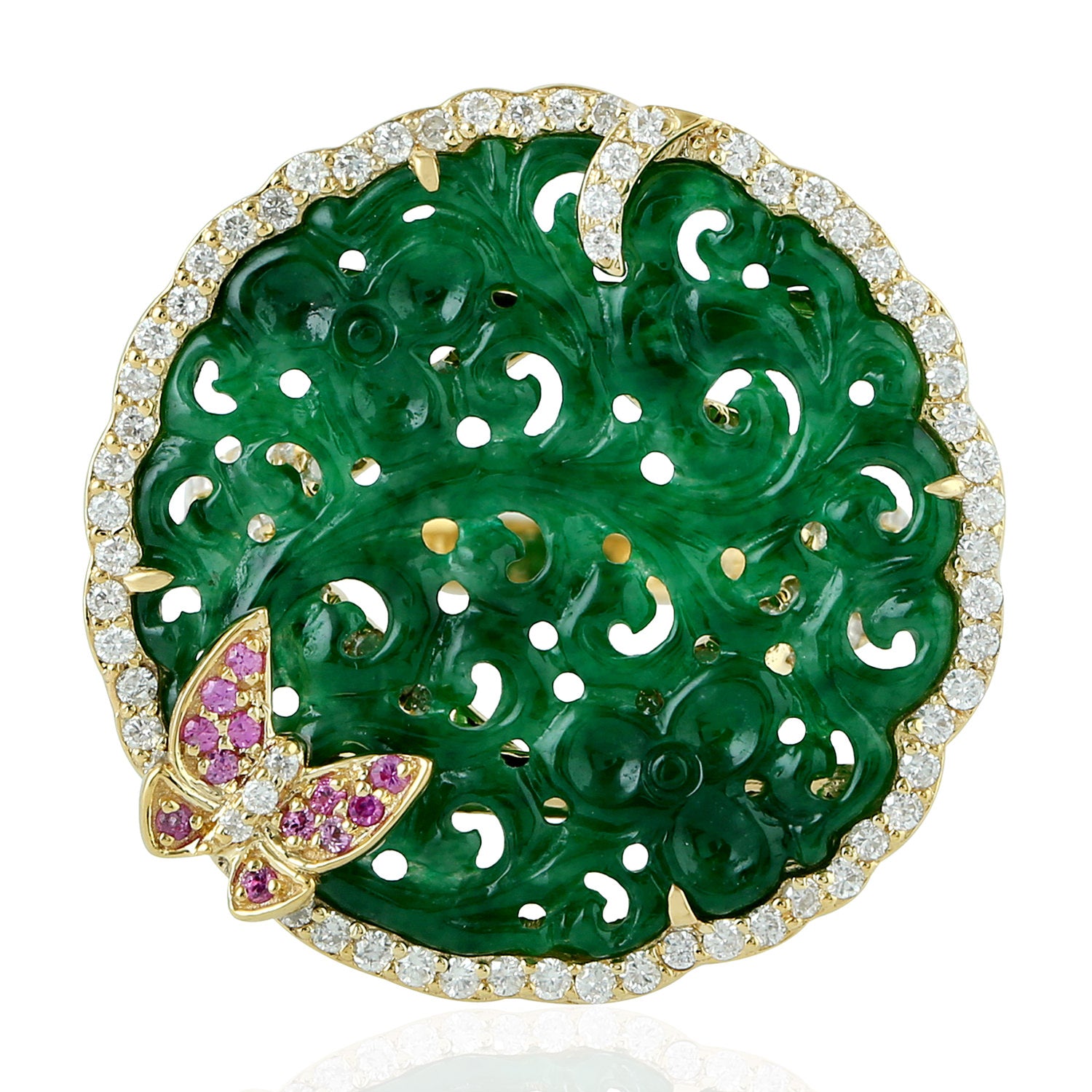 Carving Jade Pink Sapphire Gemstone Pave Diamond Butterfly Cocktail Ring In Gold