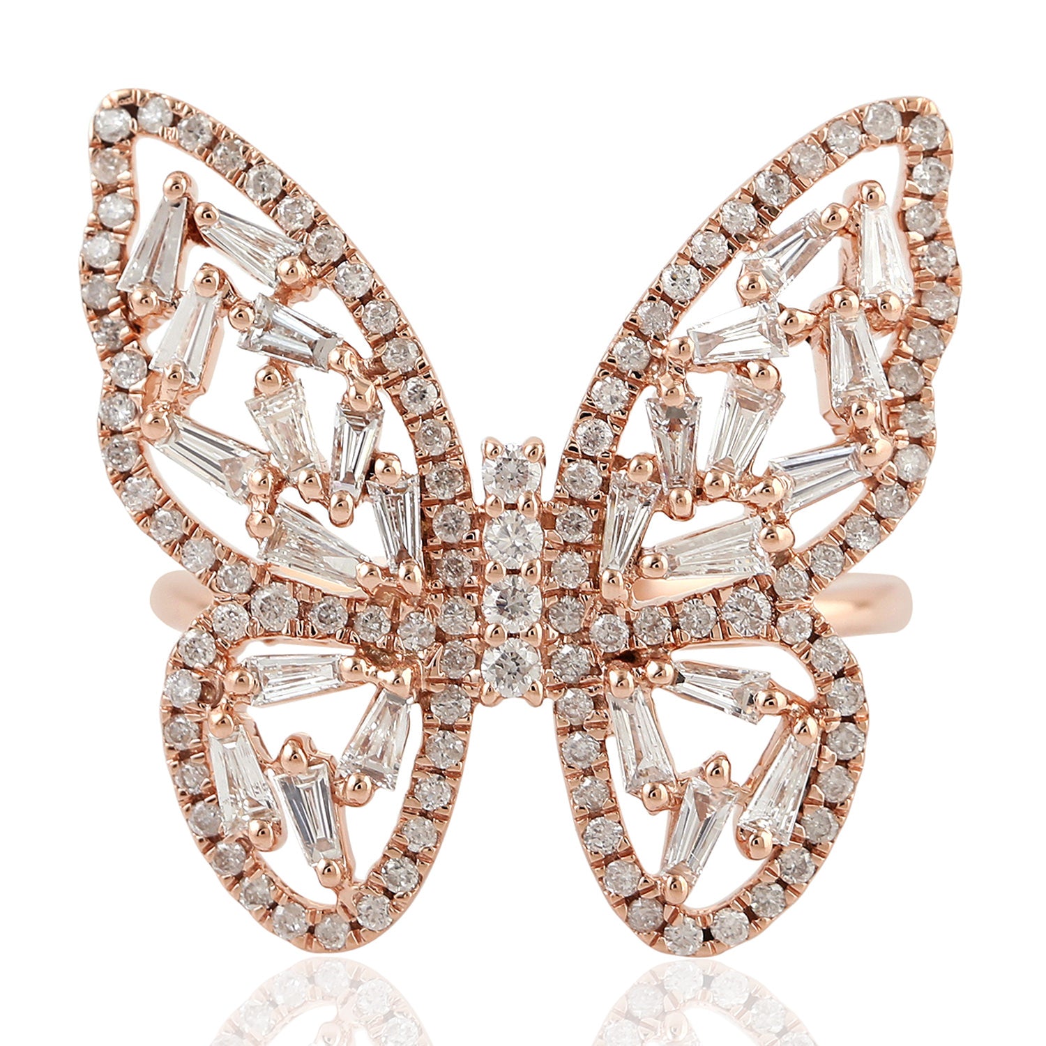 Baguette Cut Diamond Handmade Butterfly Ring In 18K Rose Gold