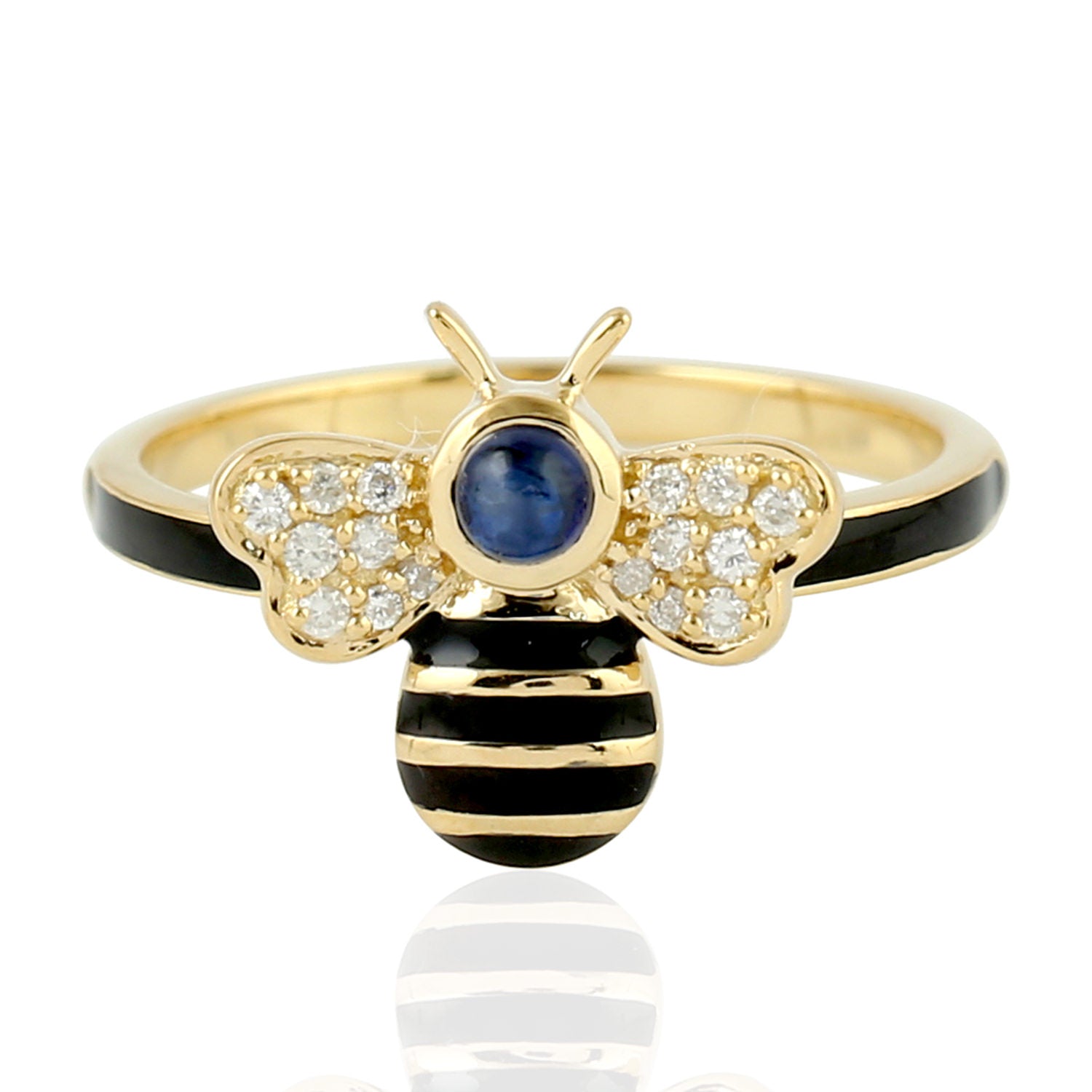 Bezel Set Blue Sapphire Pave Diamond Bee Enamel Ring In Yellow Gold