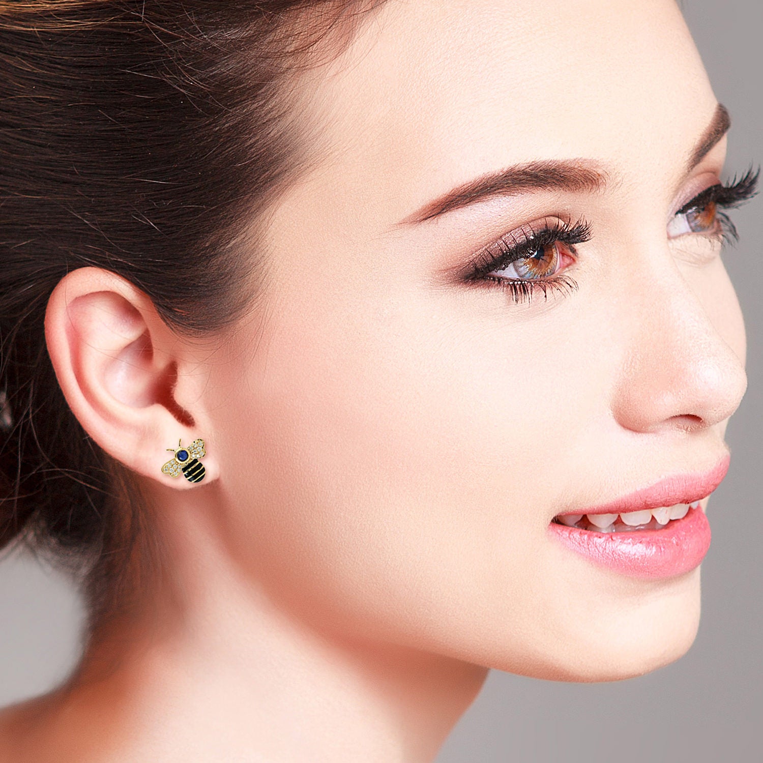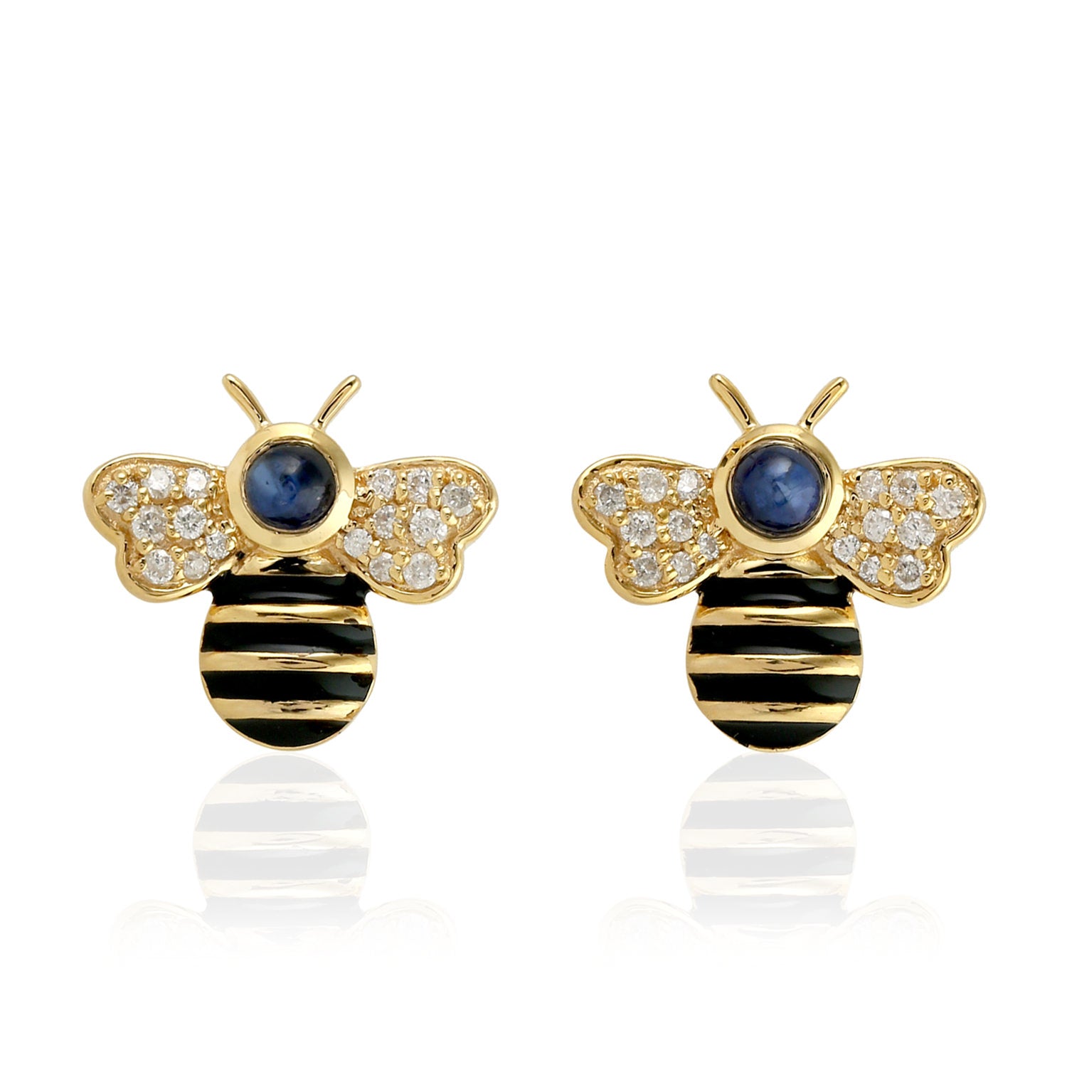 Blue Sapphire Pave Diamond Enamel Bee Stud Earrings In Yellow Gold