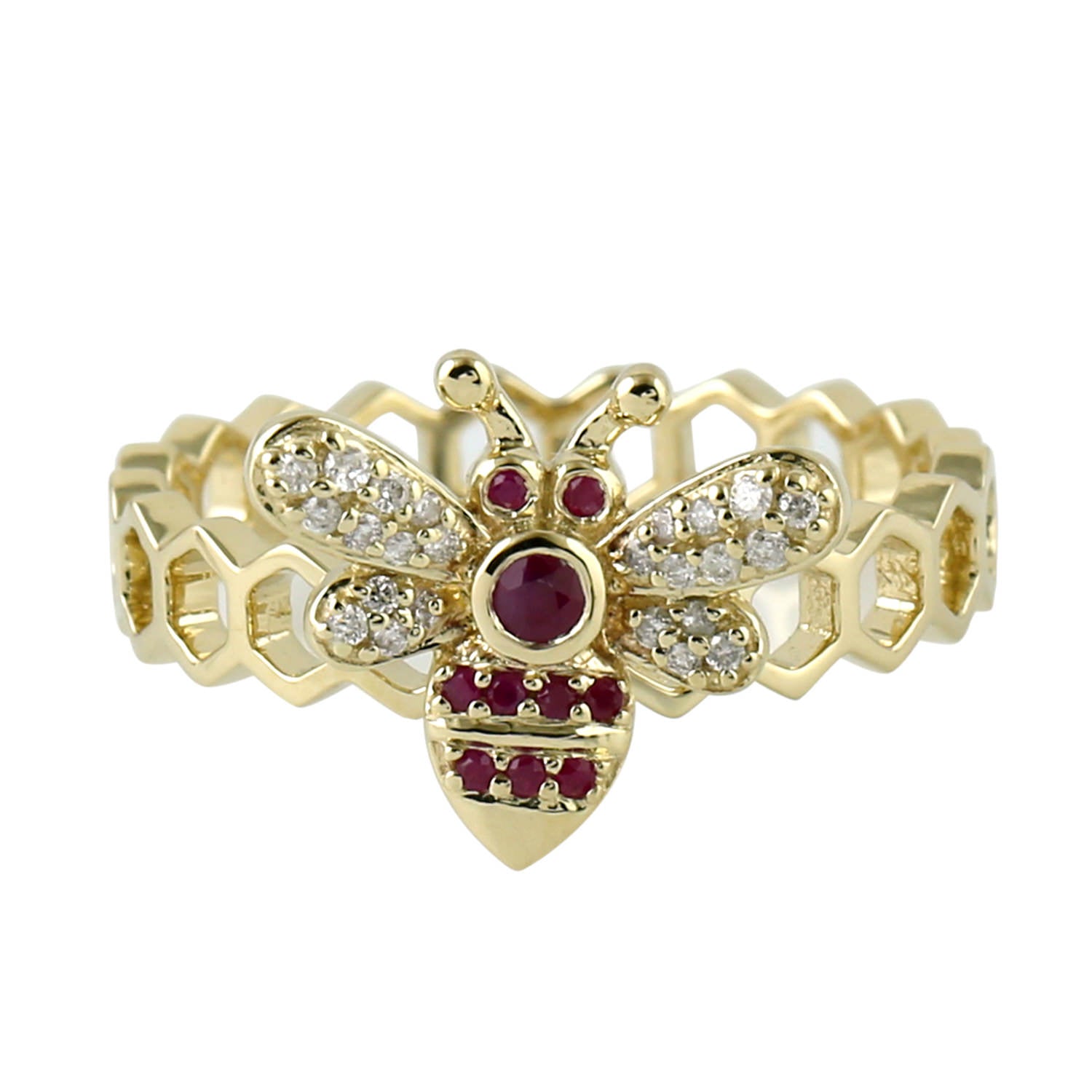 Bezel Ruby Pave Diamond Honeybee Band Ring In 14K Yellow Gold