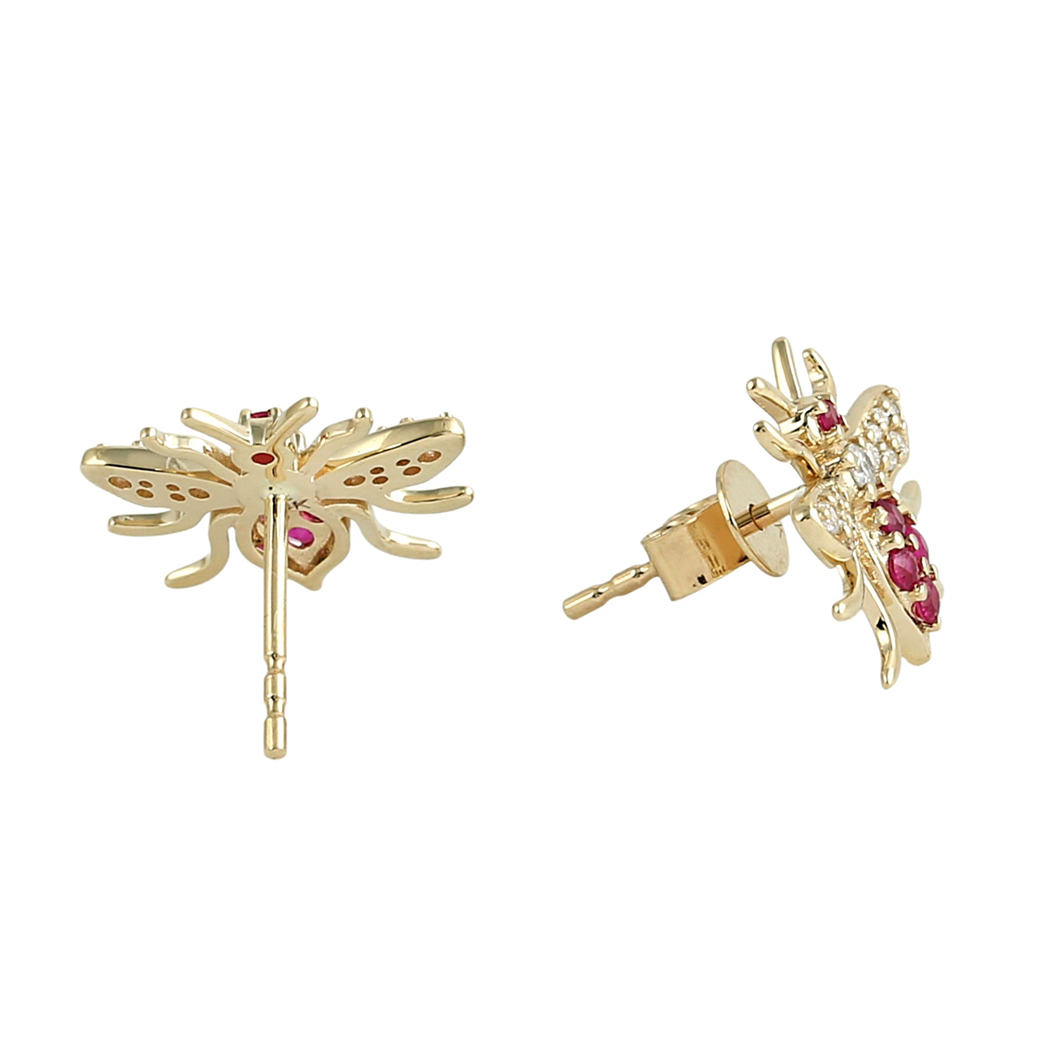 Ruby Pave Diamond Honey Bee Earrings in 14K Yellow Gold