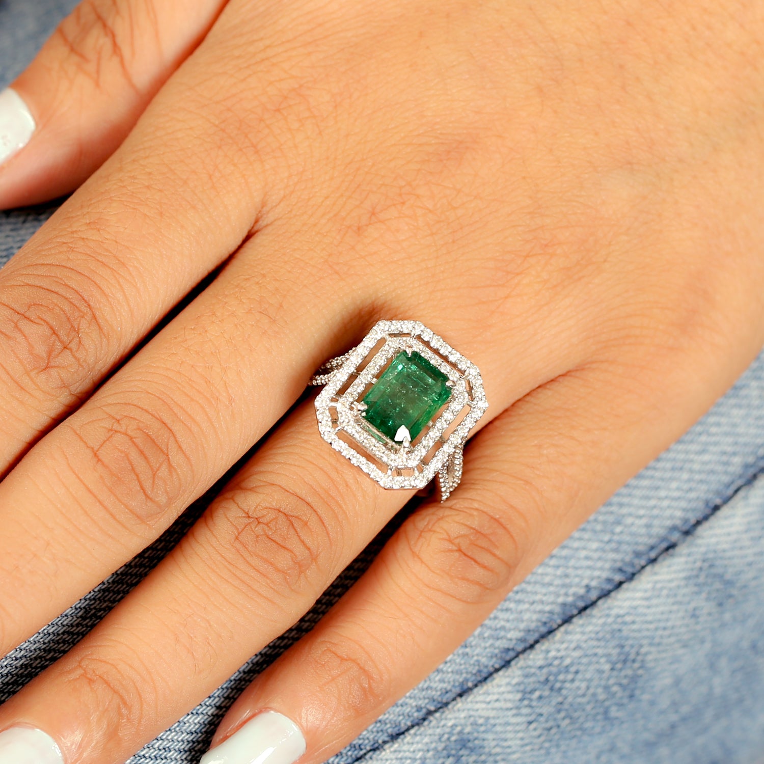 Emerald Cut Emerald May Birthstone Pave Diamond Solitaire Ring In 14K White Gold