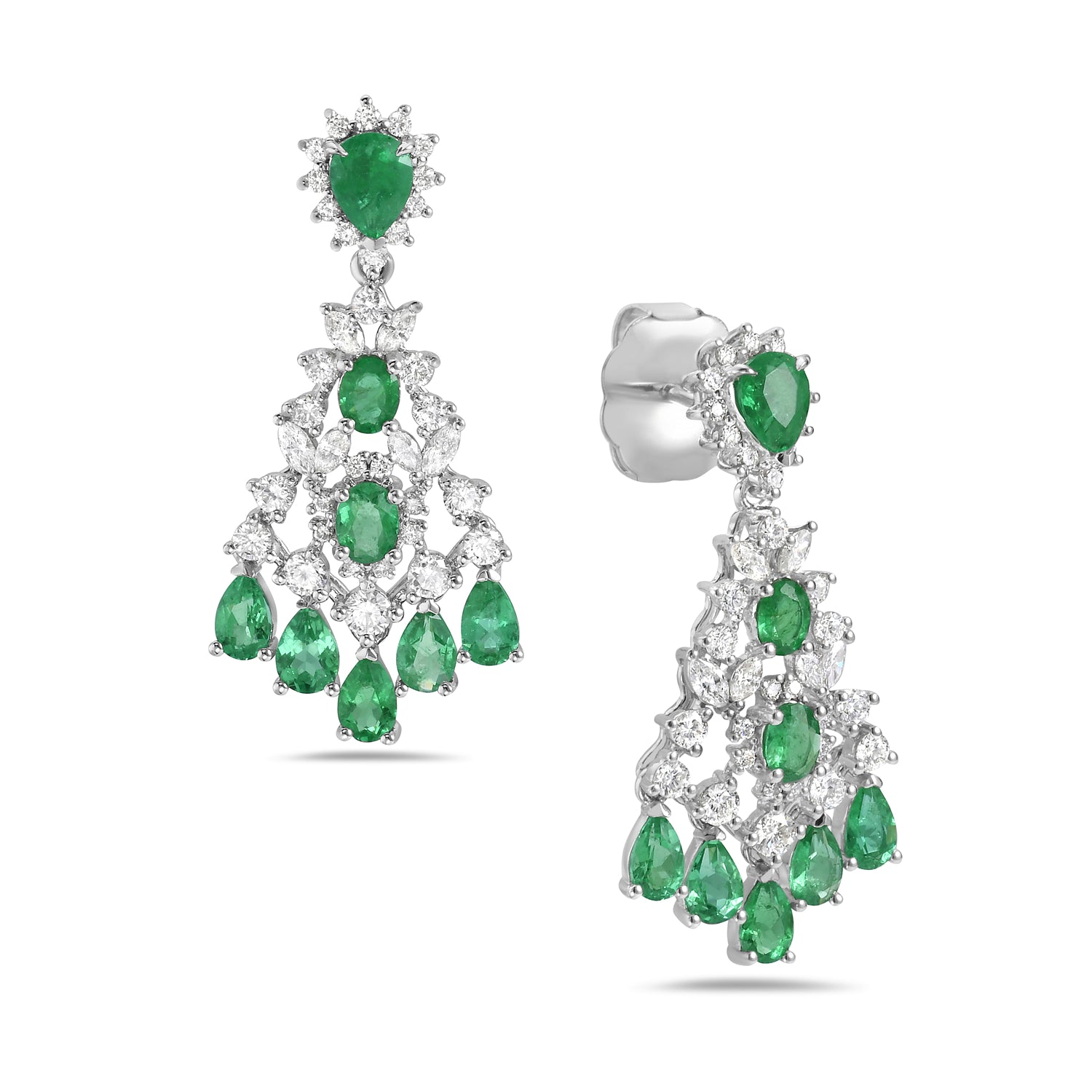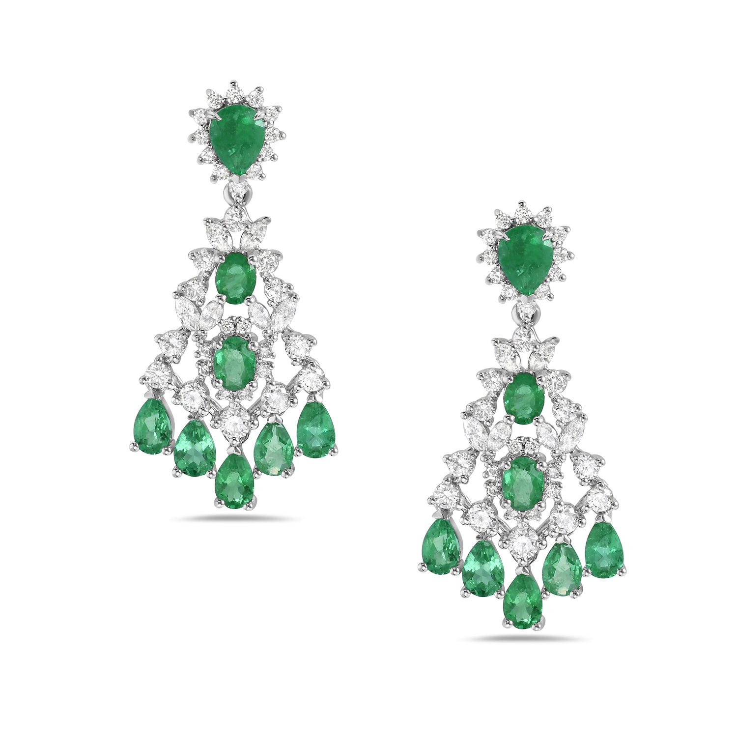 Pear Cut Emerald Prong Uncut Diamond Chandelier Earrings in 18K White Gold