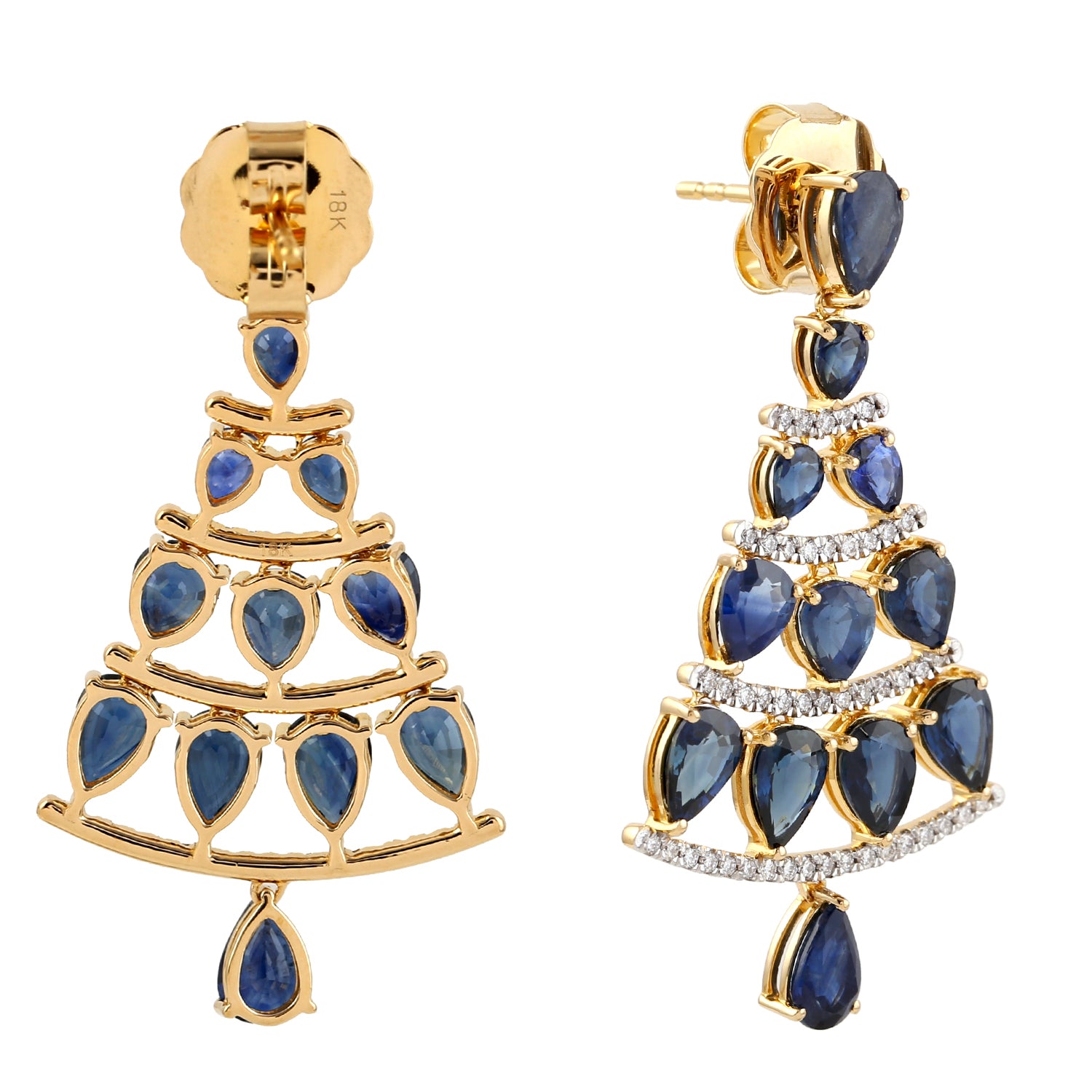 Pear Blue Sapphire Chandelier Earrings with Pave Diamonds in 18K Yellow Gold – Elegant Statement Jewelry