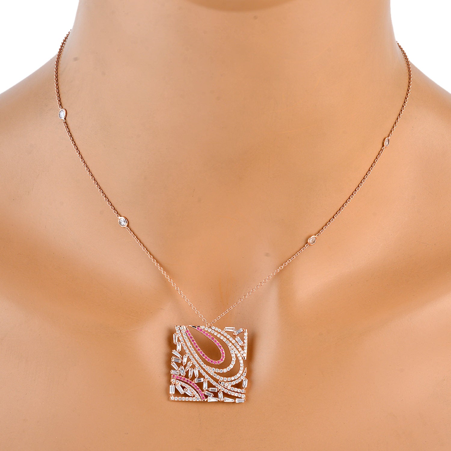 Baguette Cut Diamond & Pave Pink Sapphire Square Choker Necklace in 18K Rose Gold