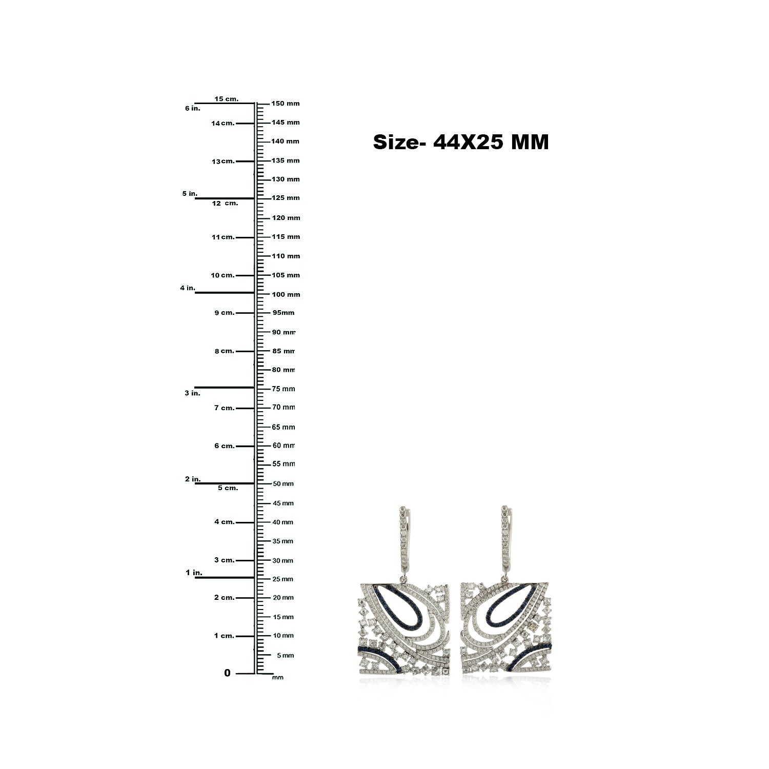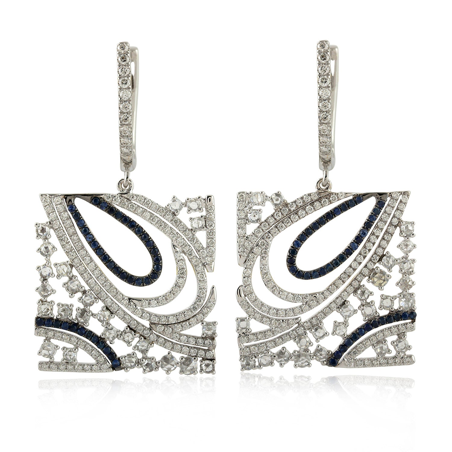 18K White Gold Prong Uncut Diamond Blue Sapphire Geometric Square Dangler