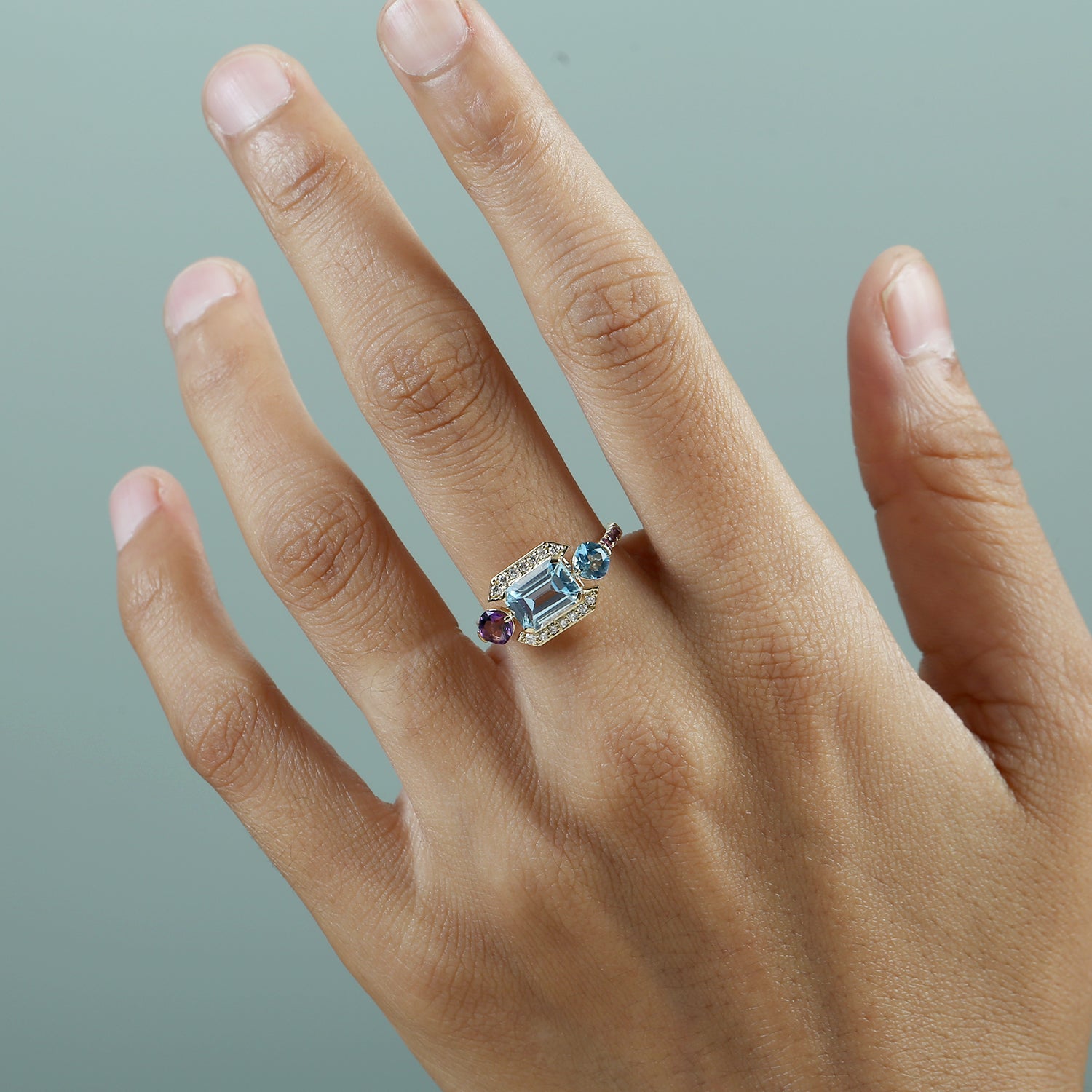 Blue Topaz & Amethyst Gemstone Pavé Diamond Designer Ring in 18K Yellow Gold
