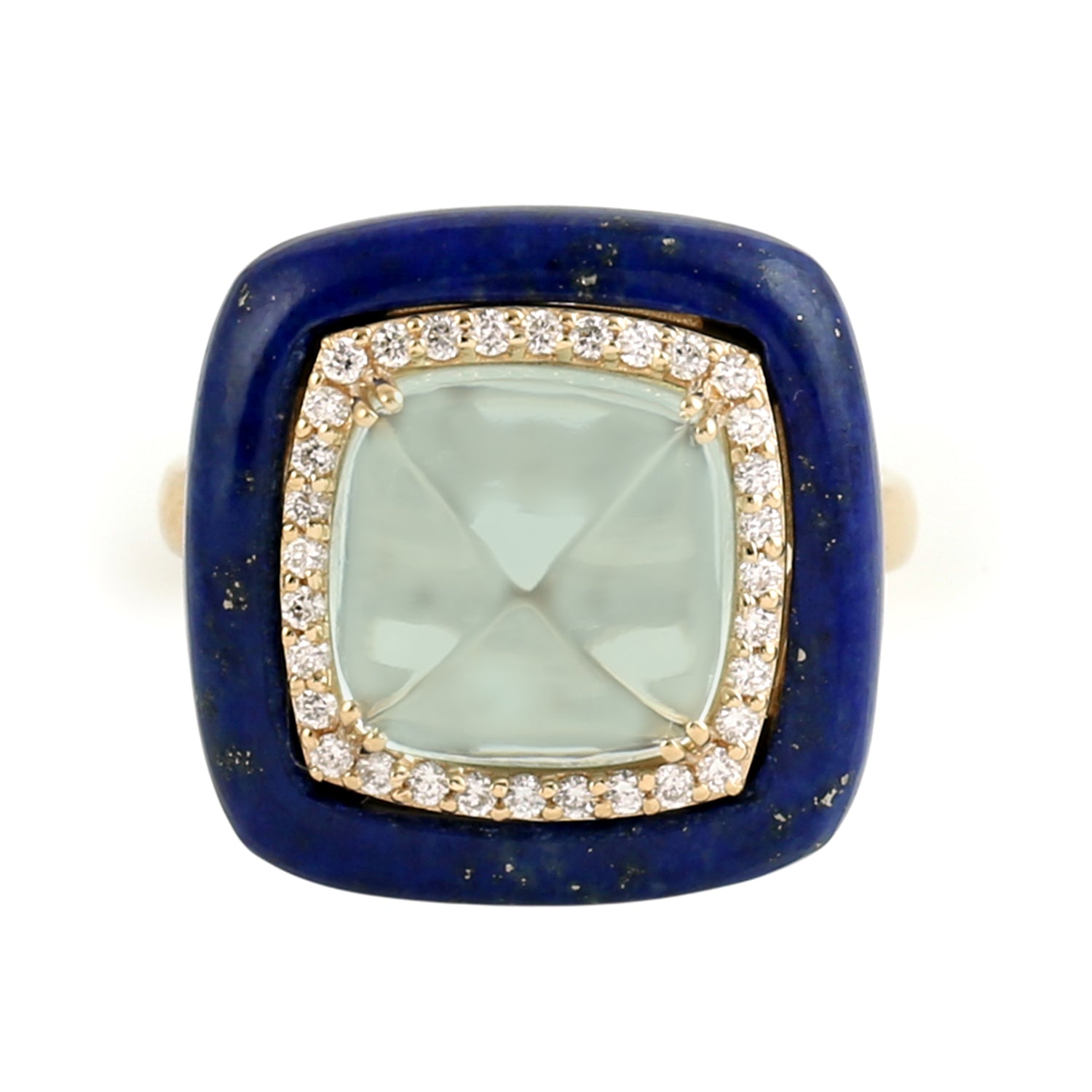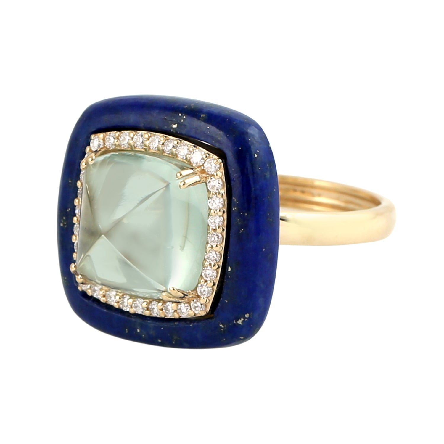 Green Amethyst and Lapis Gemstone Pave Diamond Dome Ring in 18K Yellow Gold