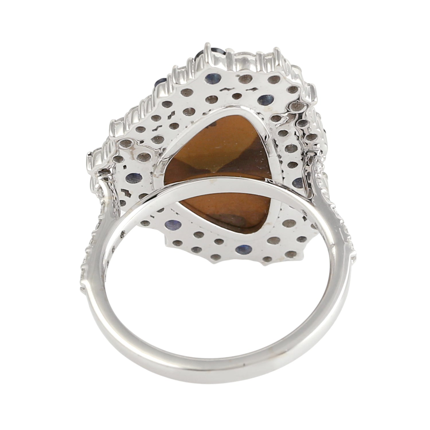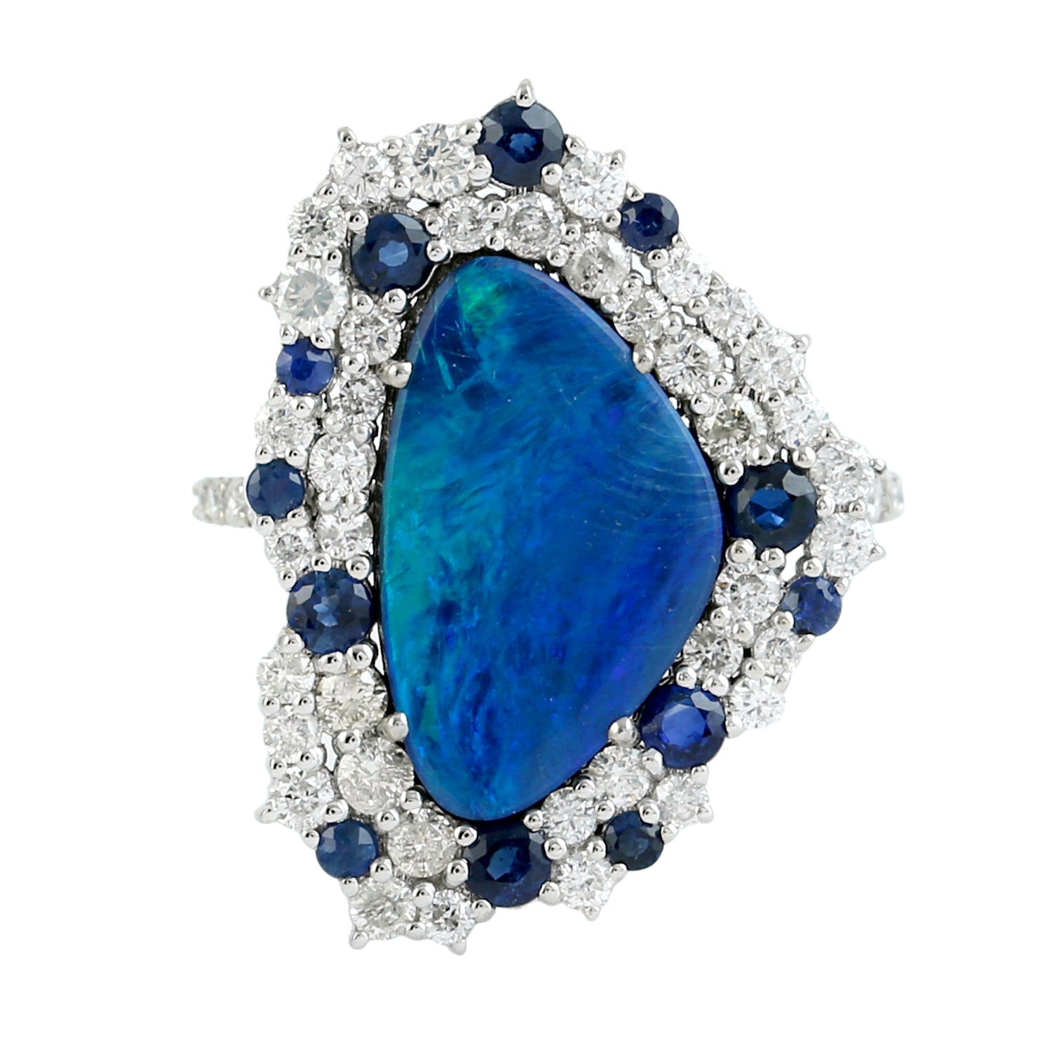 Opal Doublet & Blue Sapphire Pave Diamond Triangle Ring in 18K White Gold