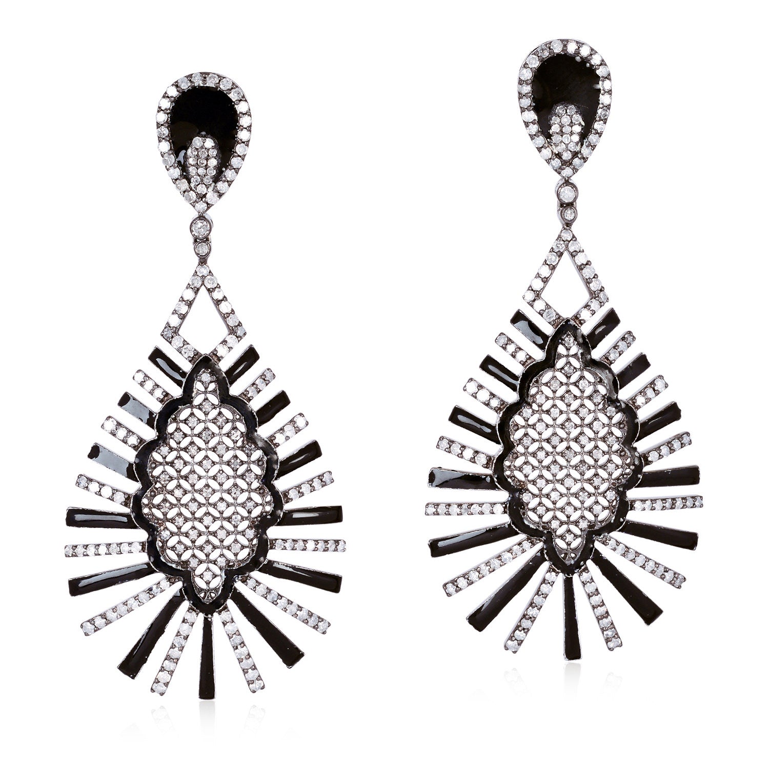 • Black Enamel Diamond Statement Drop Earrings in 18K White Gold Silver