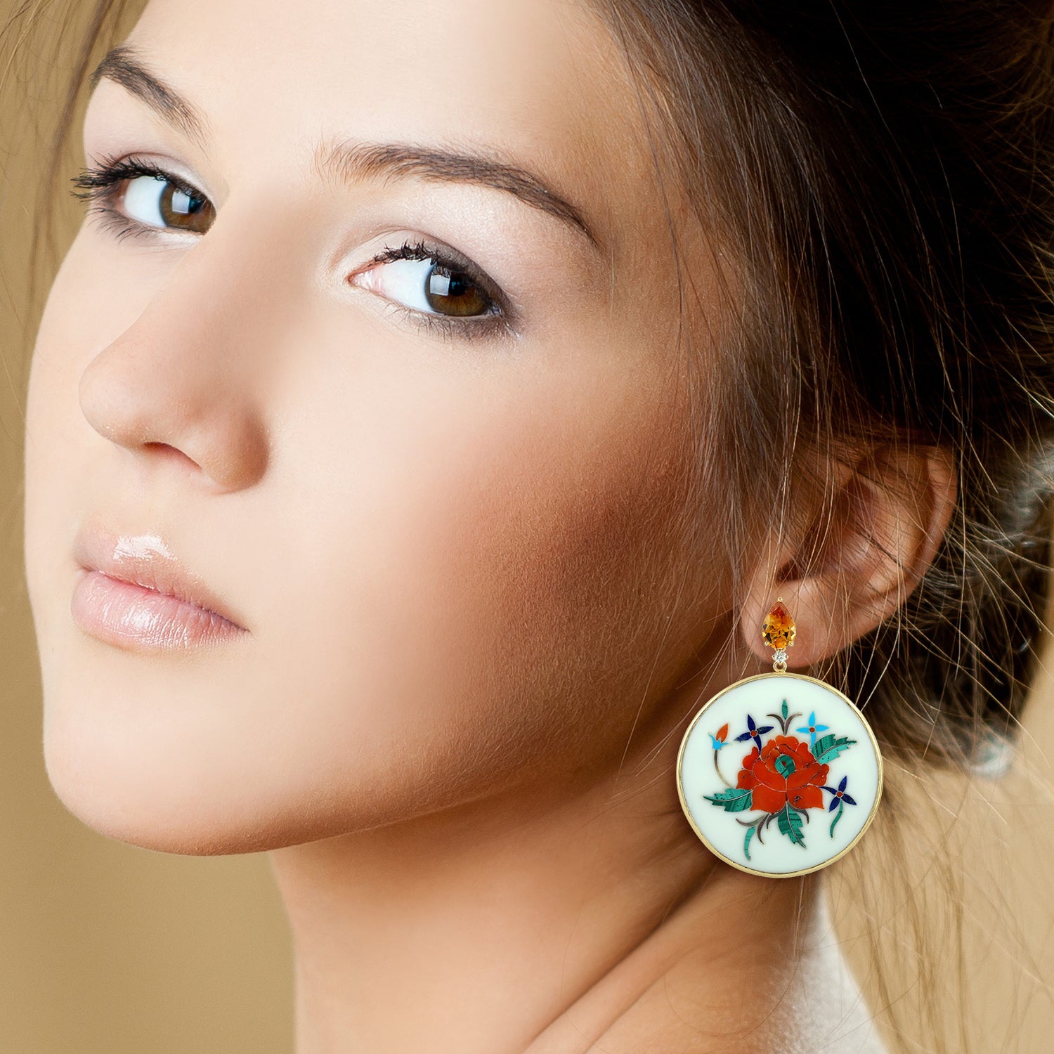 Citrine & Diamond Floral Inlay Bakelite Round Drop Earrings in 18K Yellow Gold