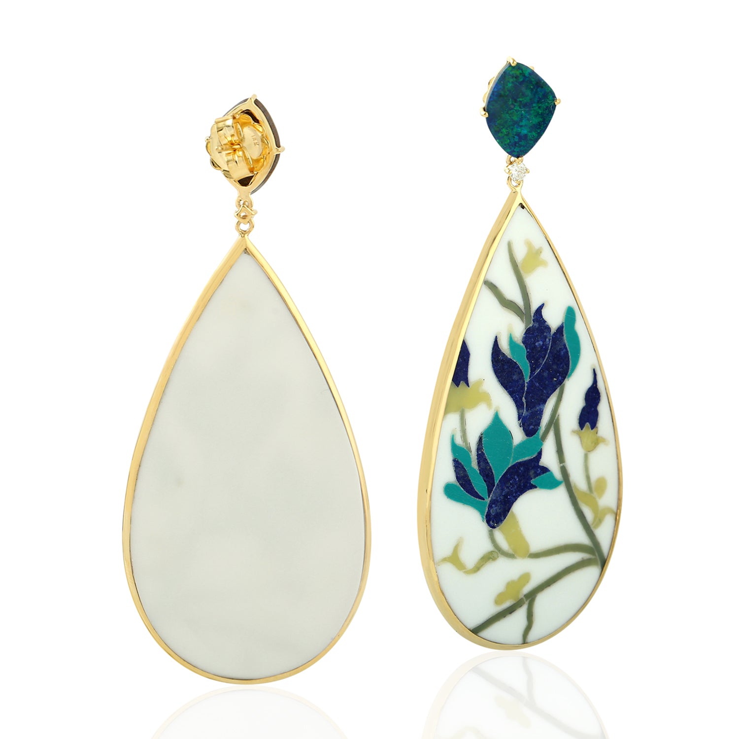 Opal Doublet Prong Diamond Floral Bakelite Teardrop Earrings in 18K Yellow Gold