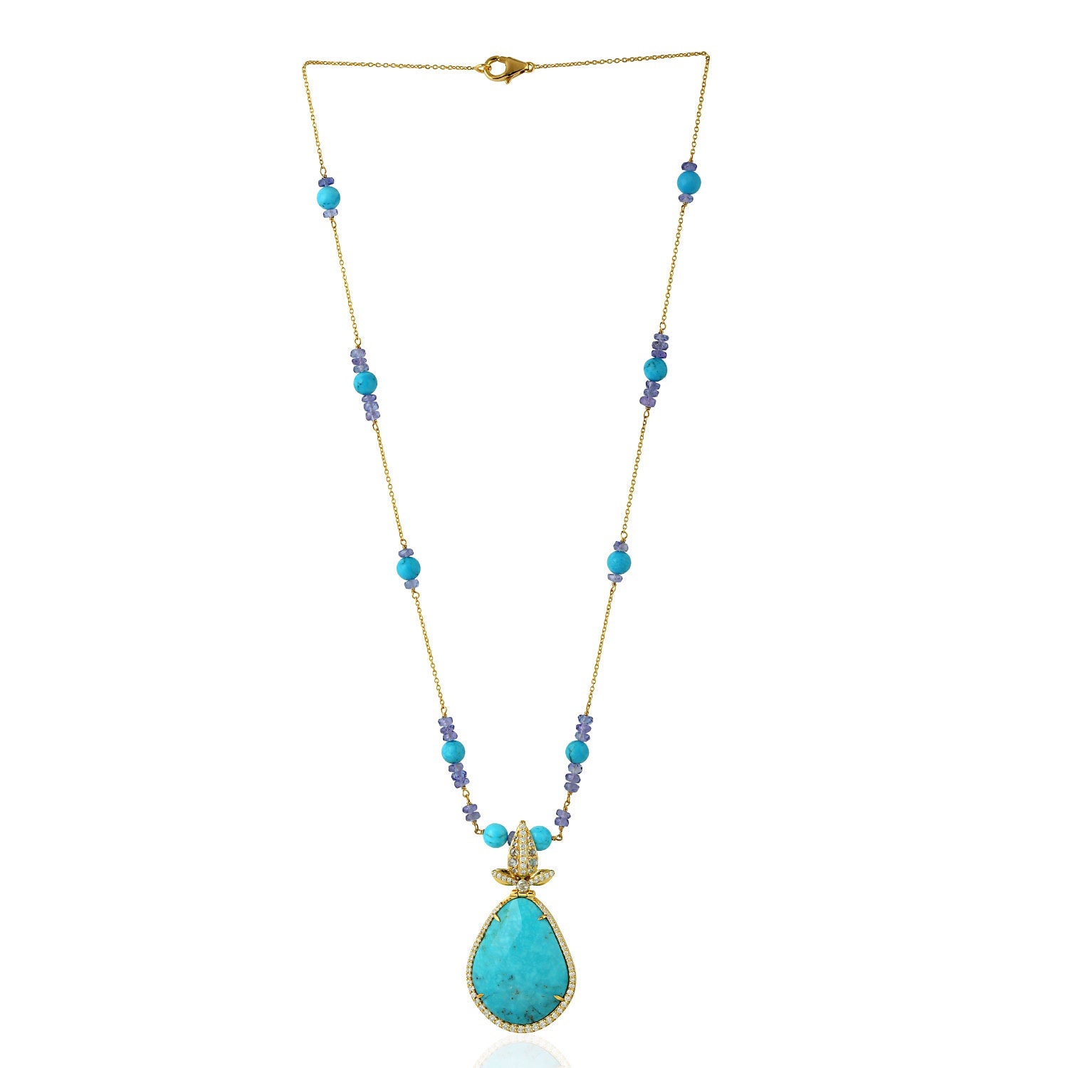 Turquoise & Tanzanite Beads Choker Necklace with Pave Diamonds in 18K Yellow Gold