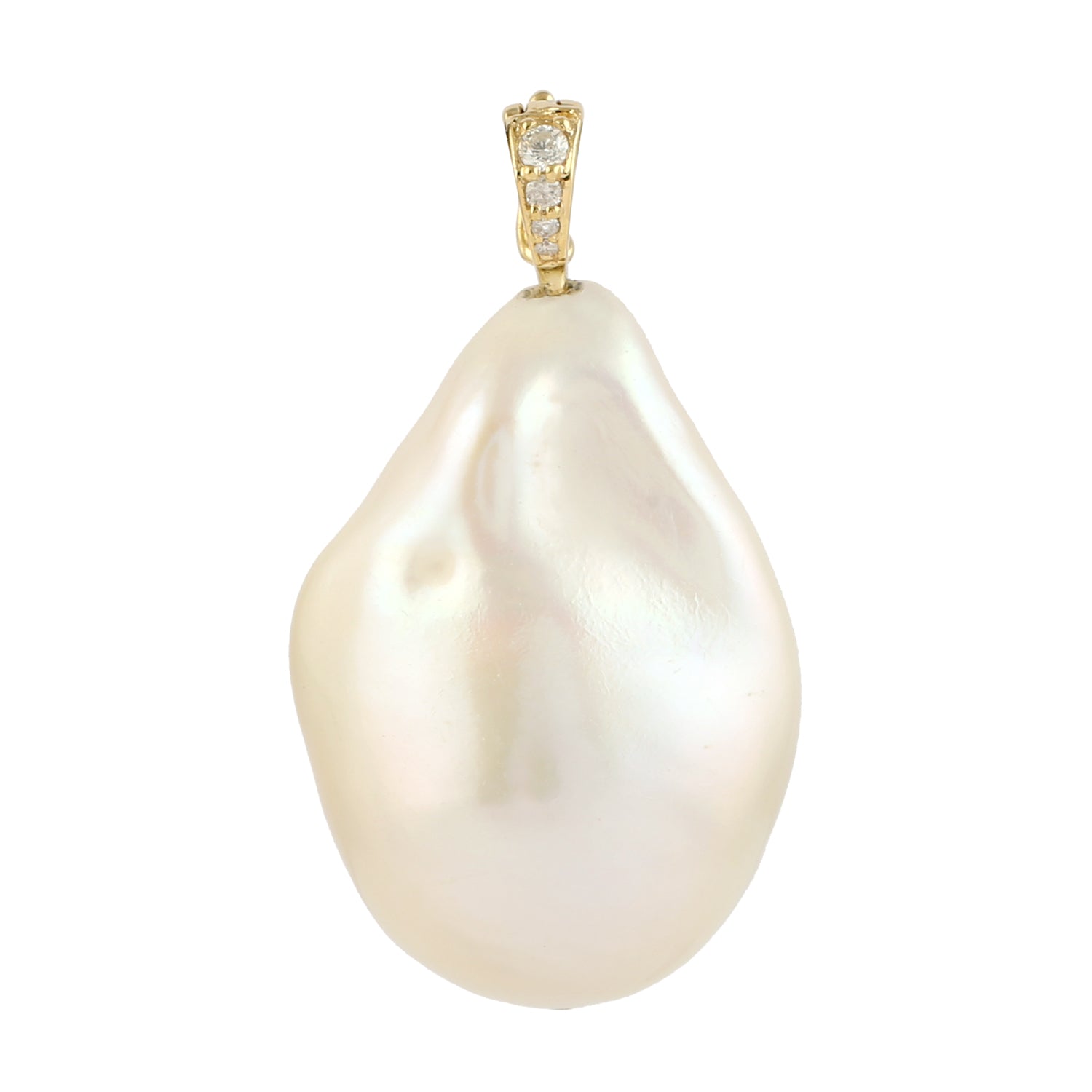 Pave Diamond Unshaped Pearl Chinese Designer Pendant In 14K Yellow Gold