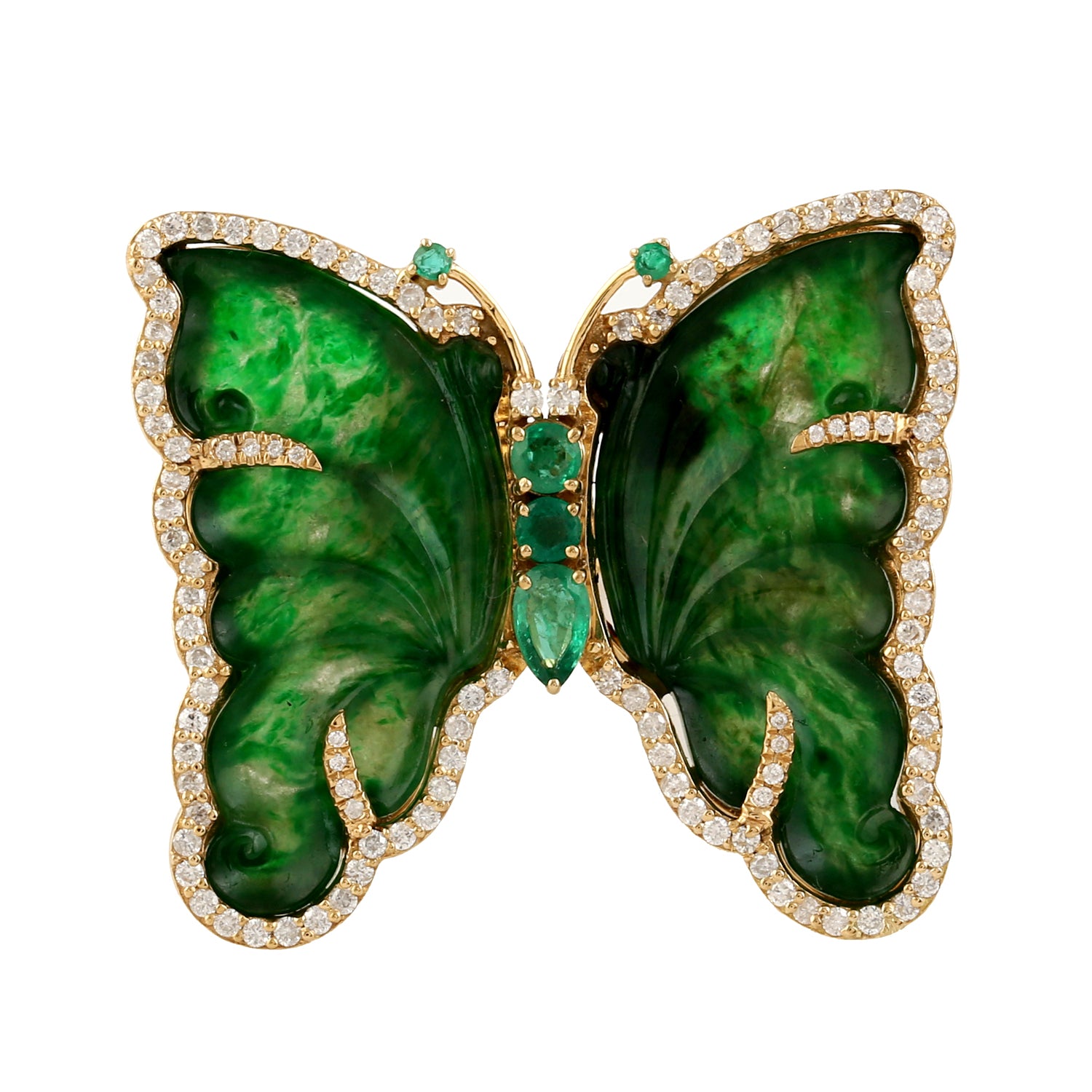 18k Yellow Gold Carved Jade Emerald Gemstone Pave Diamond Butterfly Ring