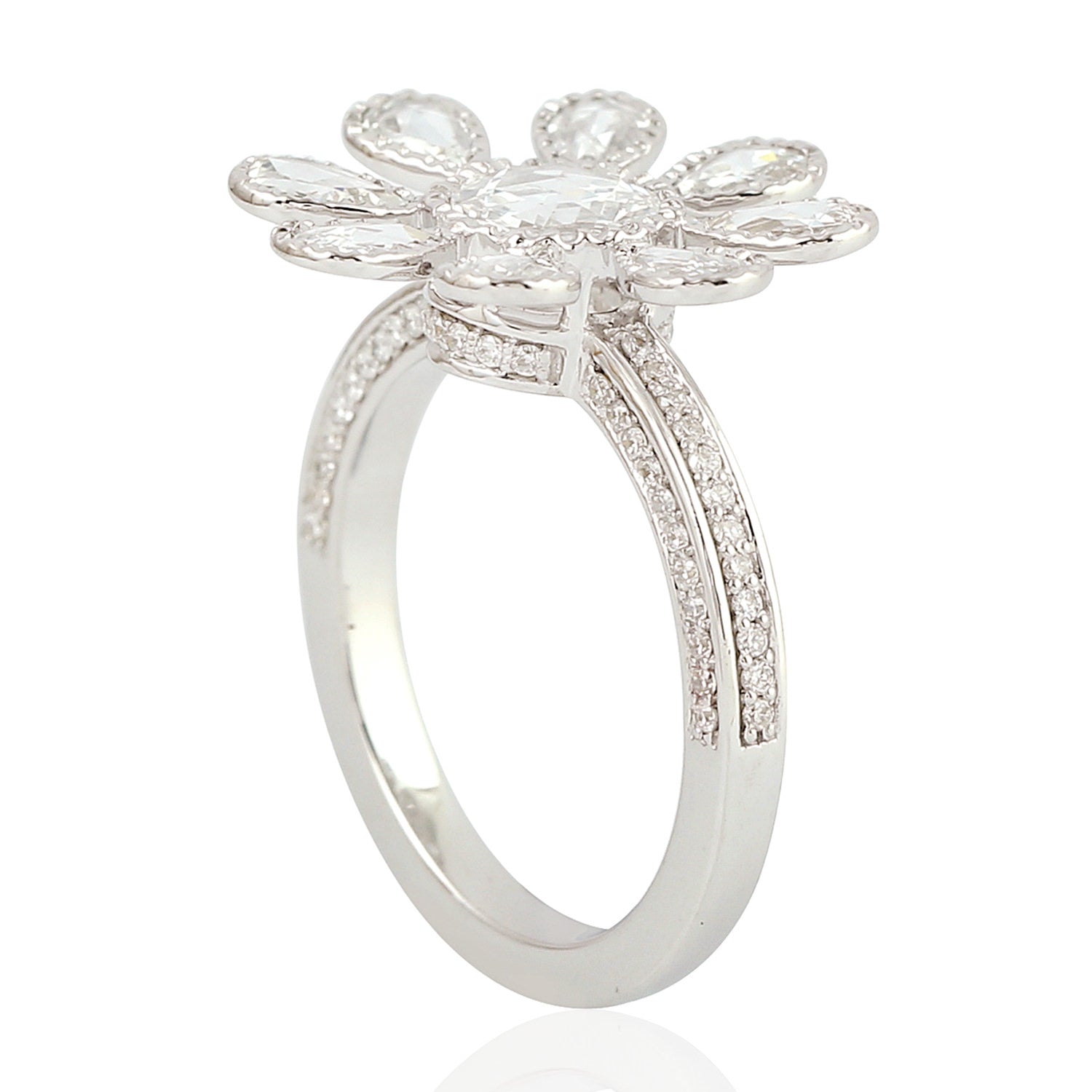 Natural Rose Cut Diamond Daisy Flower Ring in 18K White Gold – Handmade Fine Jewelry