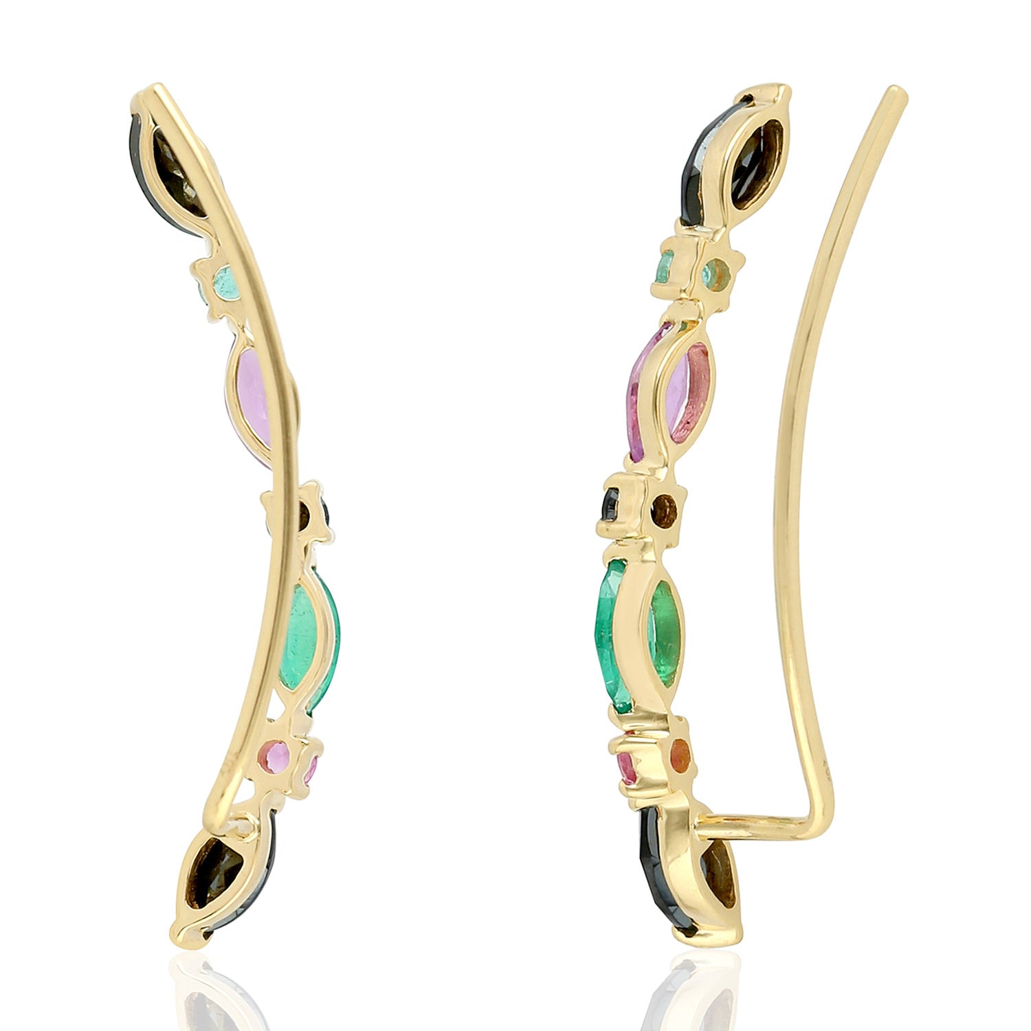 Marquise Cut Spinel Pink Sapphire Emerald Ear Climber Earrings In Yellow Gold