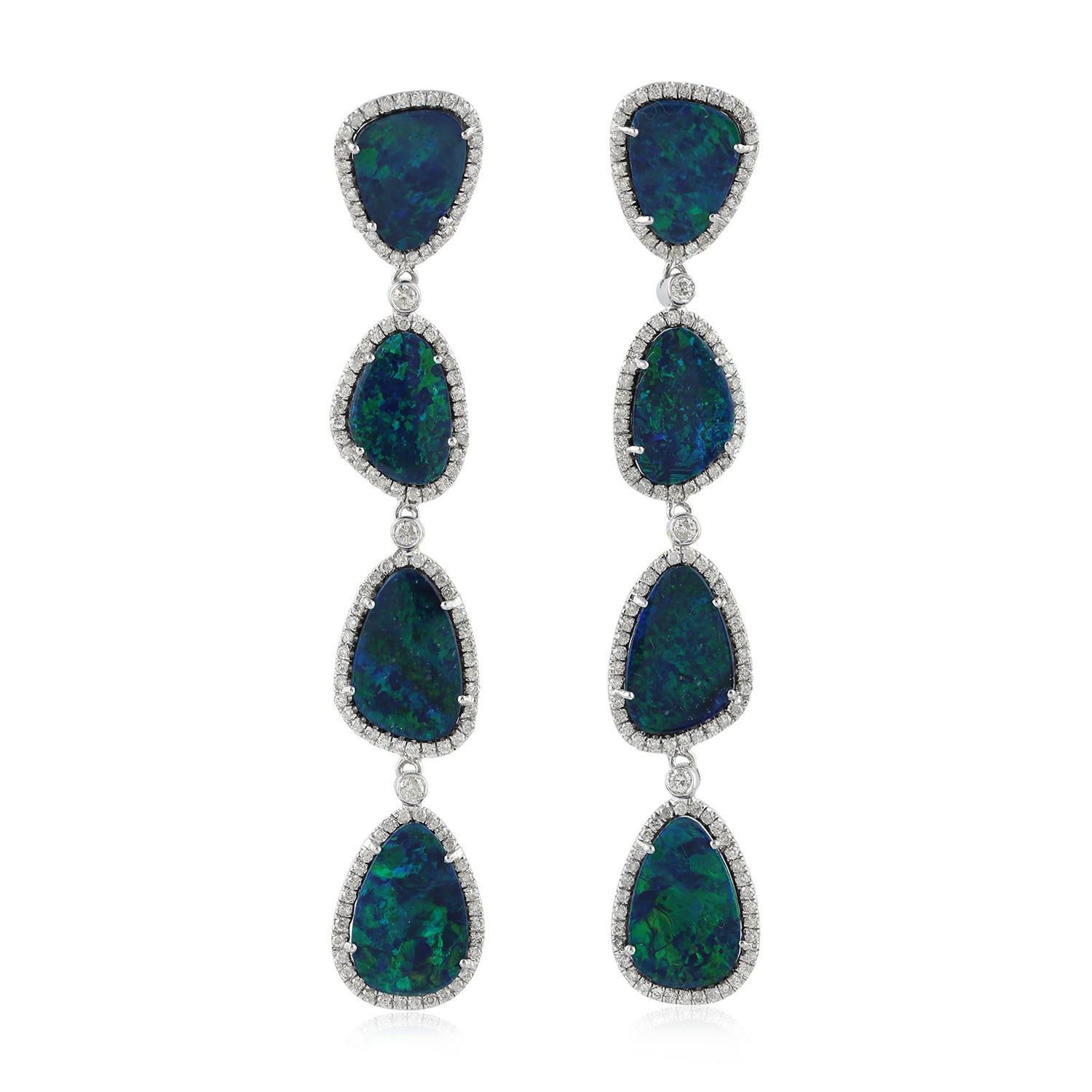 Australian Blue Opal Multi-Drop Diamond Halo Long Earrings in 18K White Gold