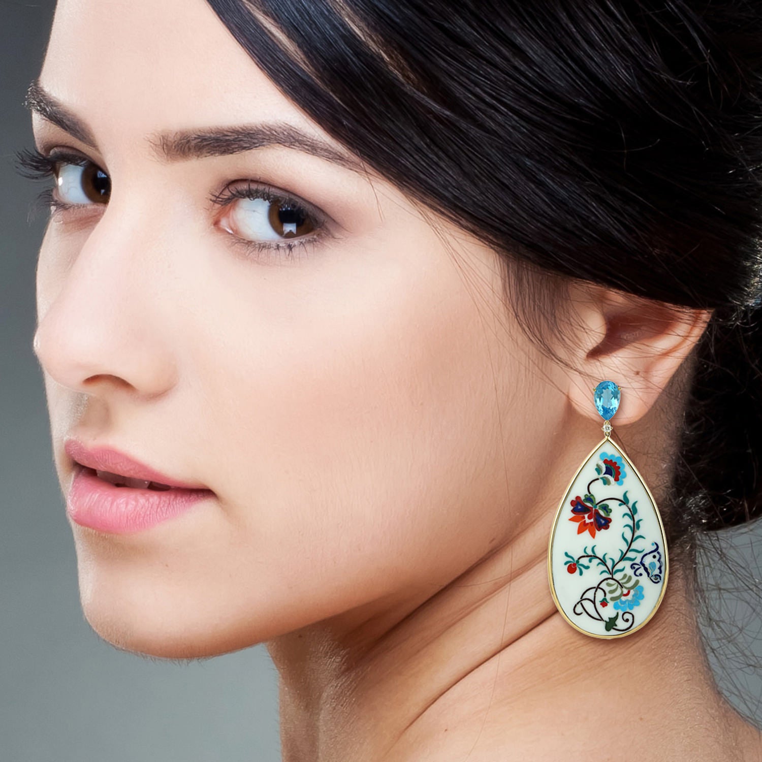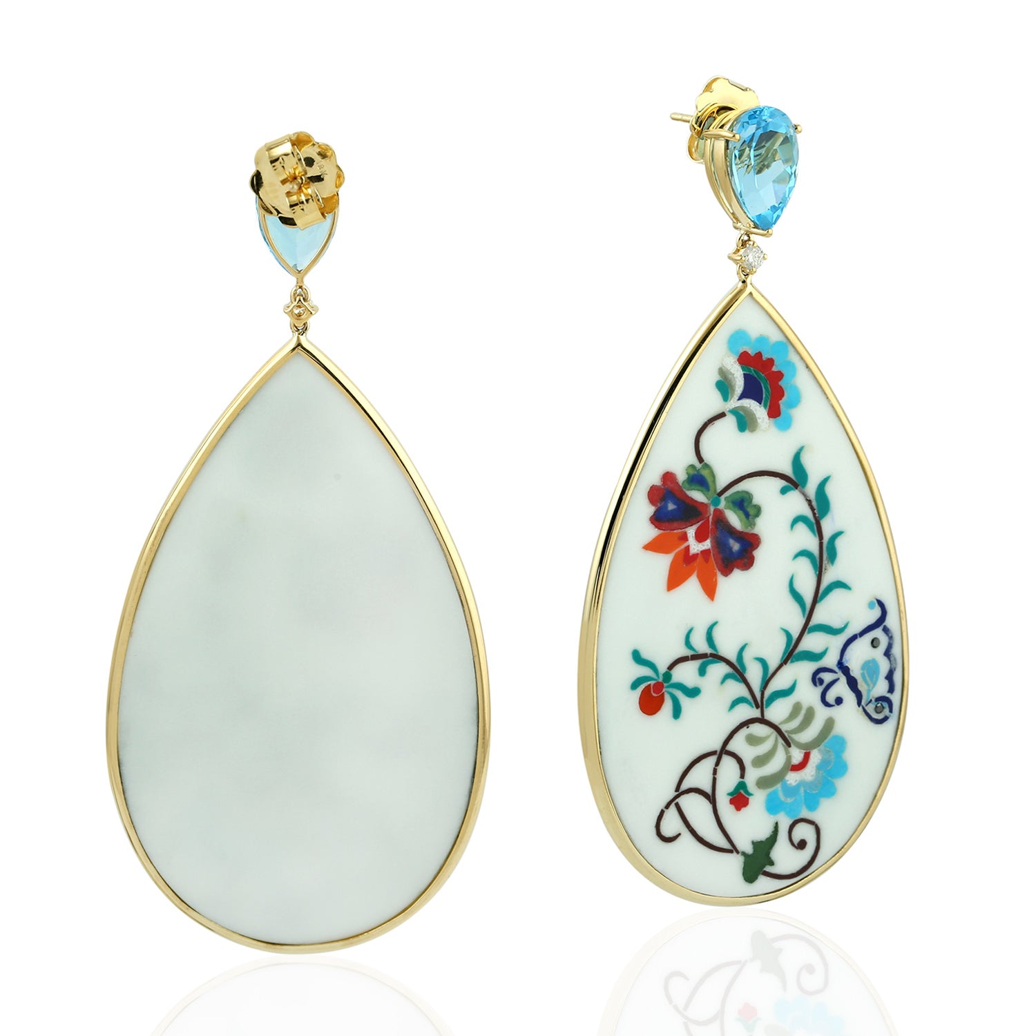 Blue Topaz & Diamond Bakelite Floral Teardrop Earrings in 18K Yellow Gold