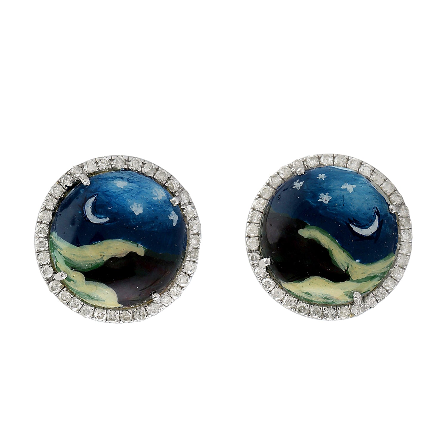 MOP & Diamond Halo Night Sky Enamel Stud Earrings in 18K White Gold
