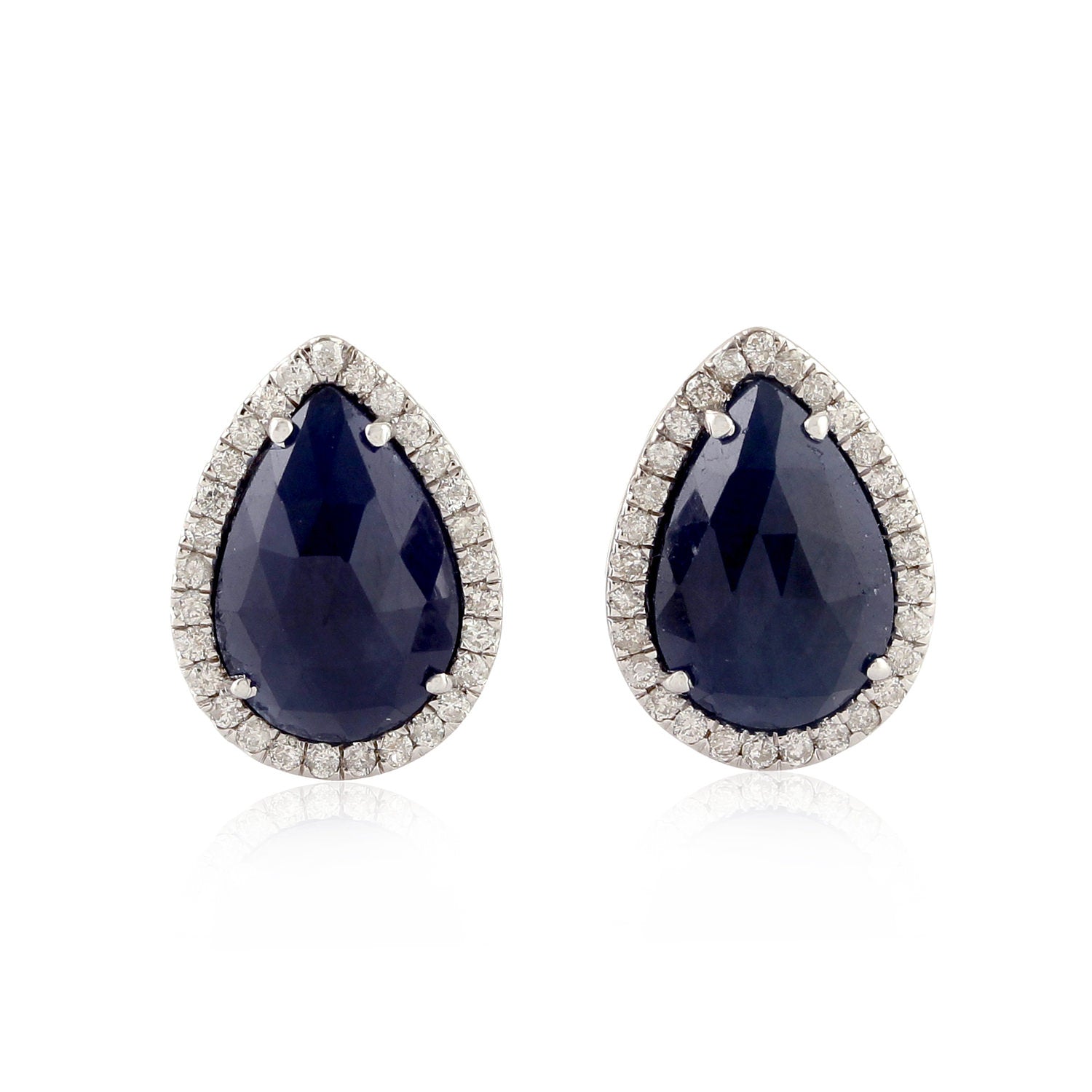 Pear Cut Blue Sapphire Gemstone Pave Diamond Stud Earrings In 18K White Gold