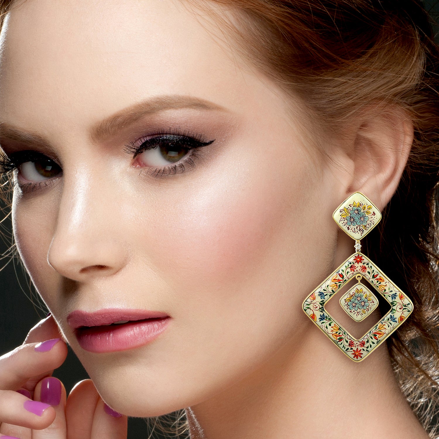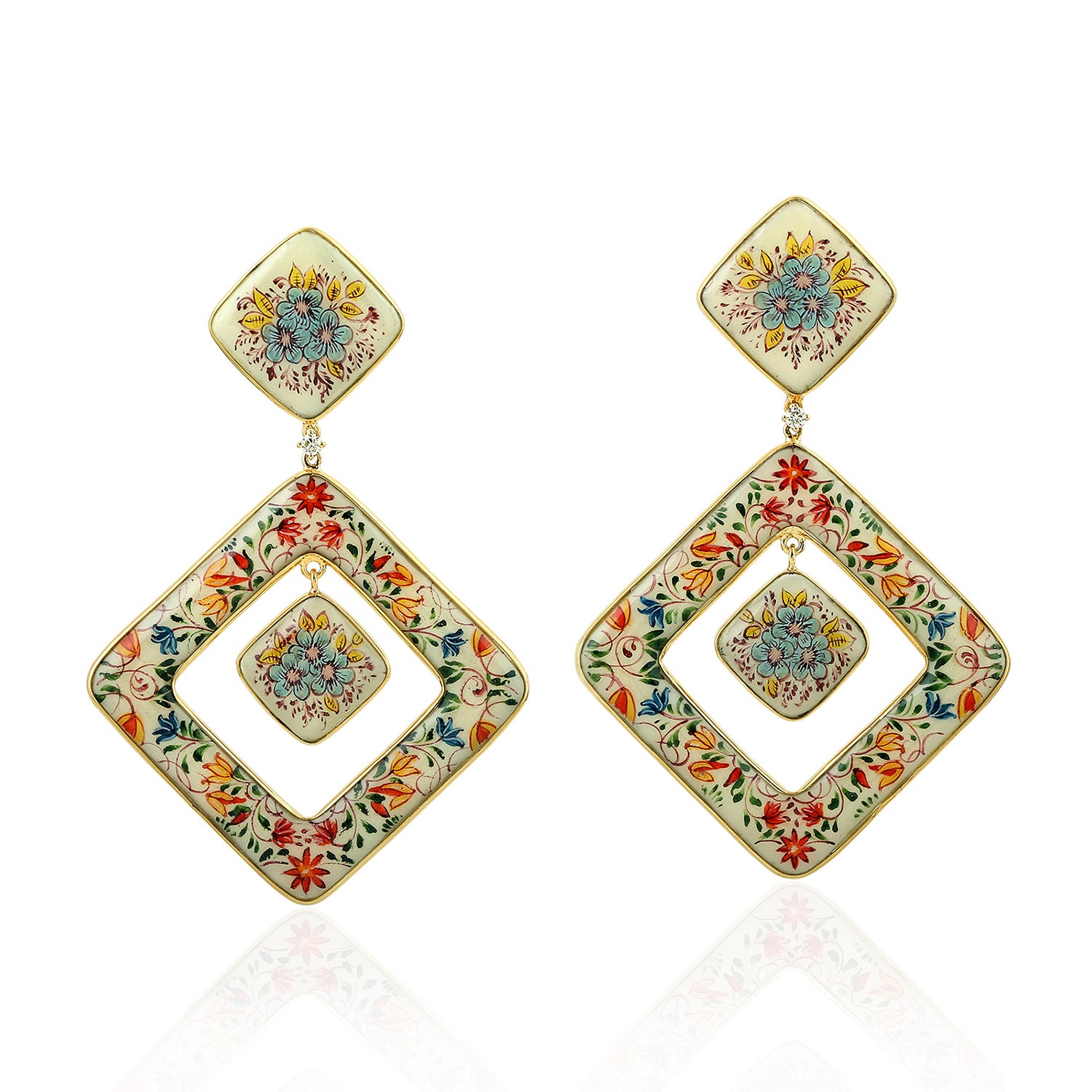 Picture Bakelite Prong Diamond Square Cut Dangler In 18K Yellow Gold