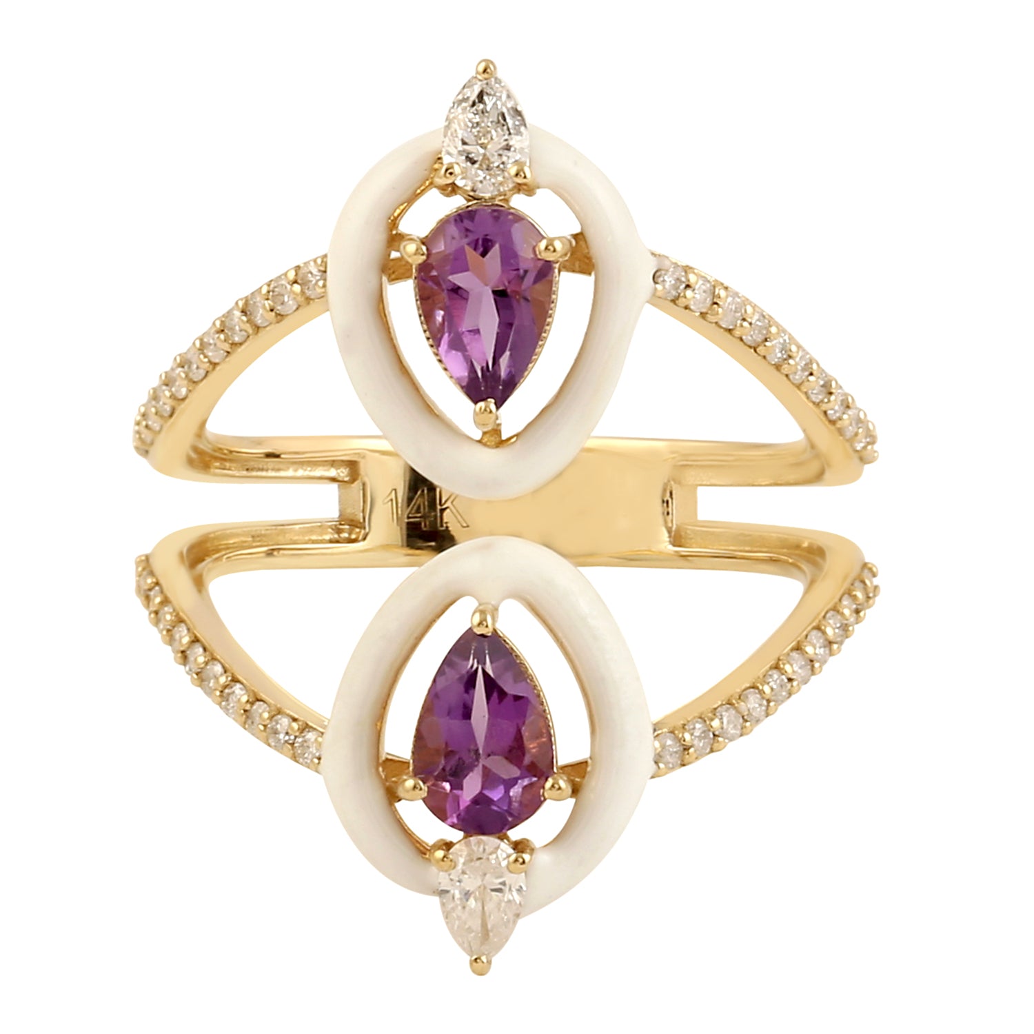 14k Yellow Gold Micro Pave Diamond Pear Cut Amethyst Enamel Designer Ring