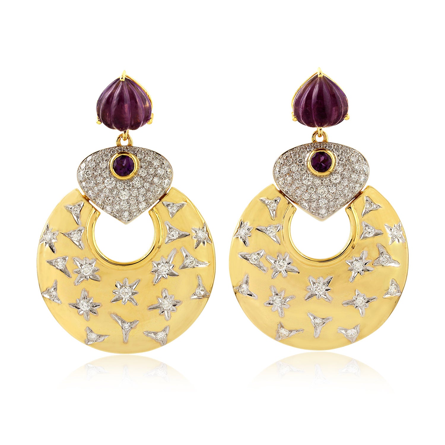 Amethyst Gemstone Pave Diamond Designer Danglers In Yellow And White Gold