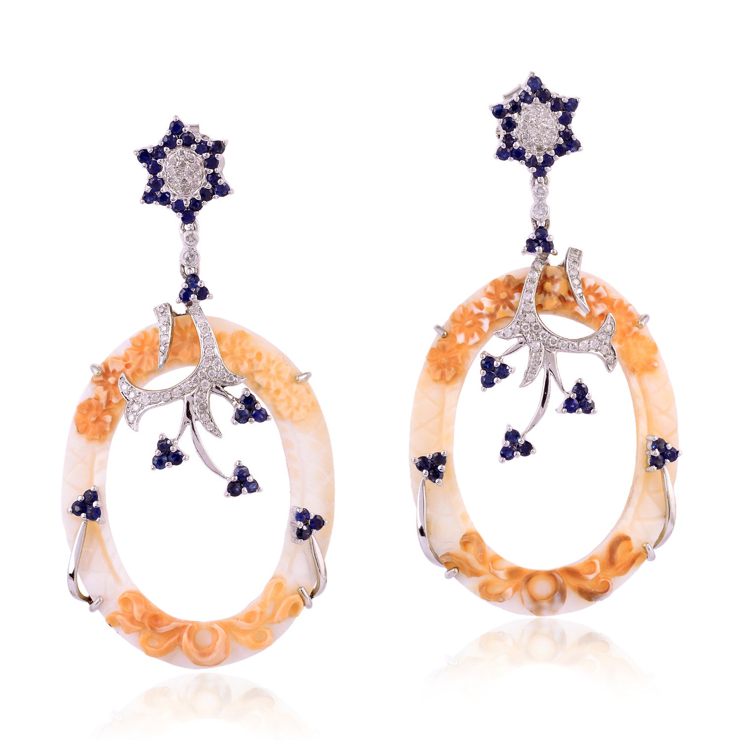 Carved Shell Cameo Prong Blue Sapphire Diamond Floral Dangler In White Gold