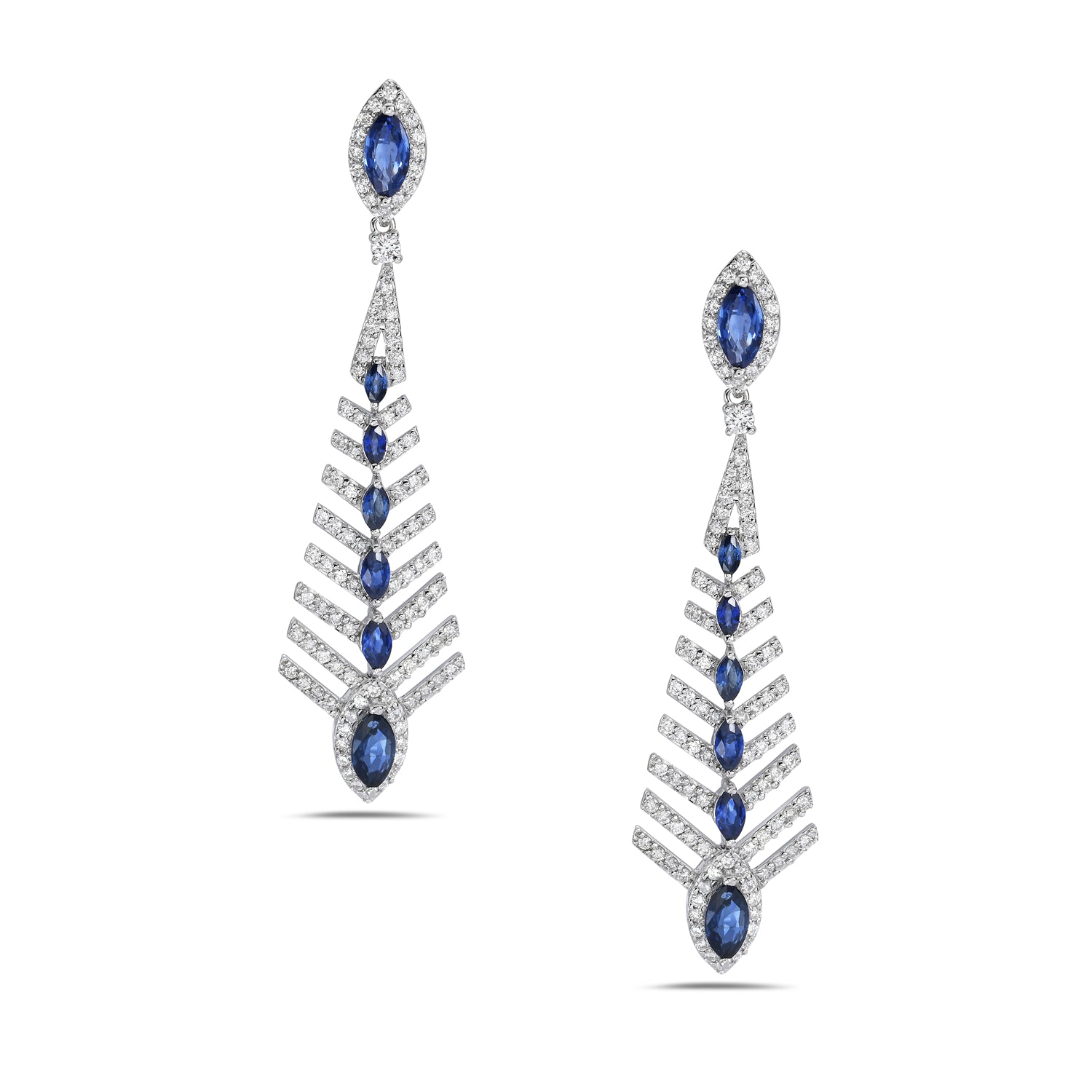 Pave Diamond Marquise Blue Sapphire Leaf Drop Danglers In 18k White Gold