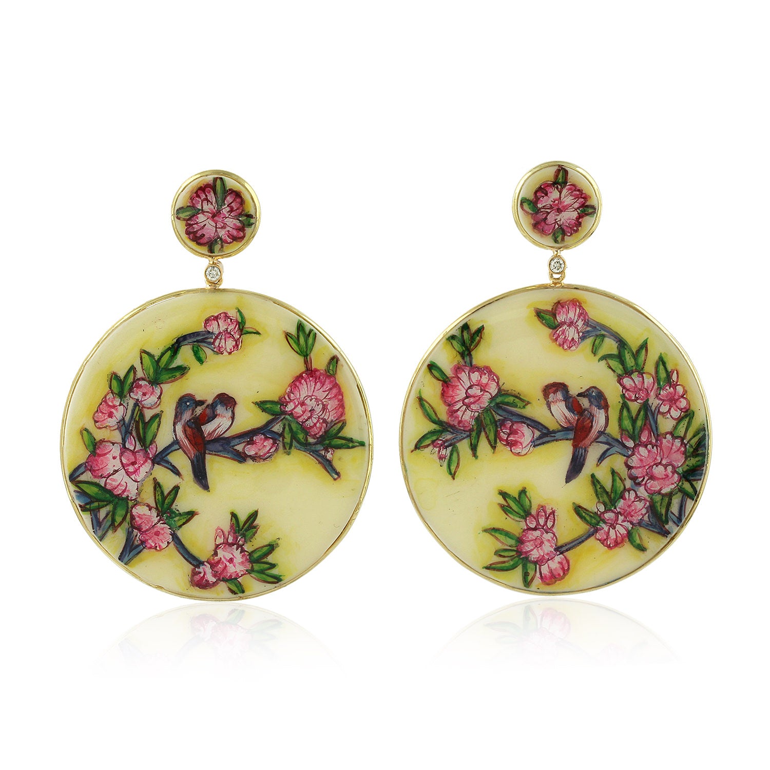 Picture Bakelite Prong Diamond Flower Dangler In 18K Yellow Gold