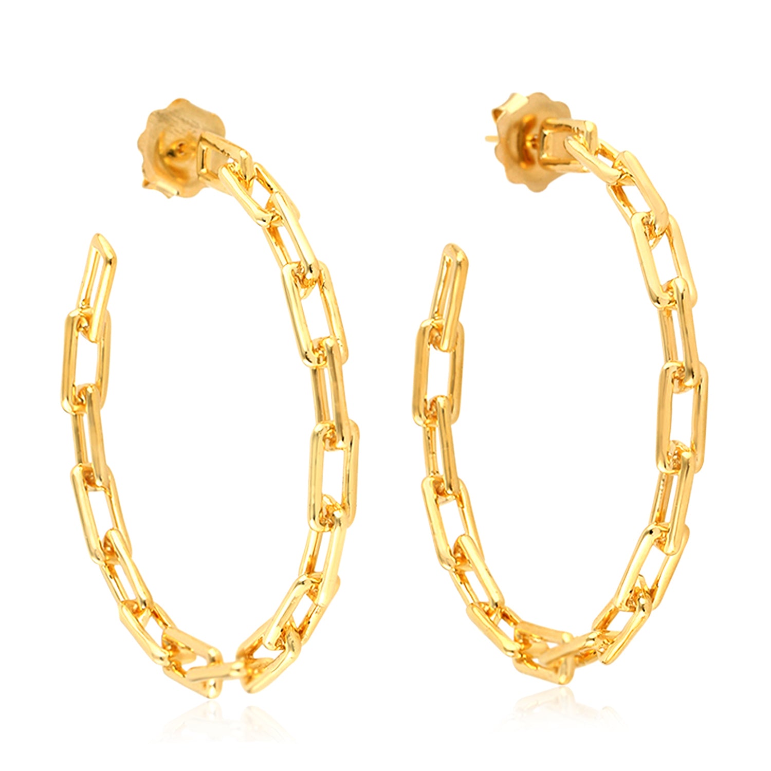 18K Yellow Gold Link Chain Design Long Hoop Earrings