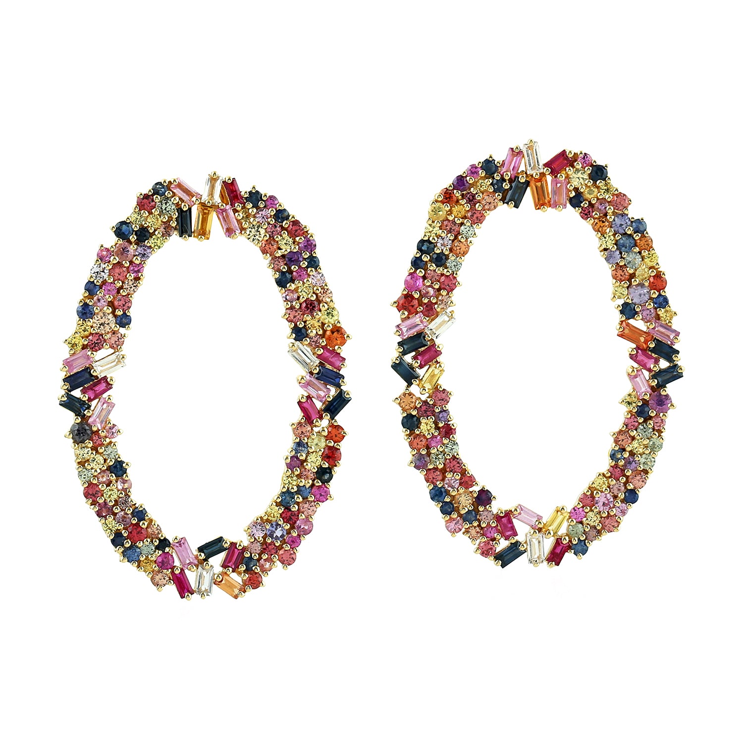 • Multicolor Sapphire Gemstone Cluster Front Hoop Earrings in 18k Yellow Gold