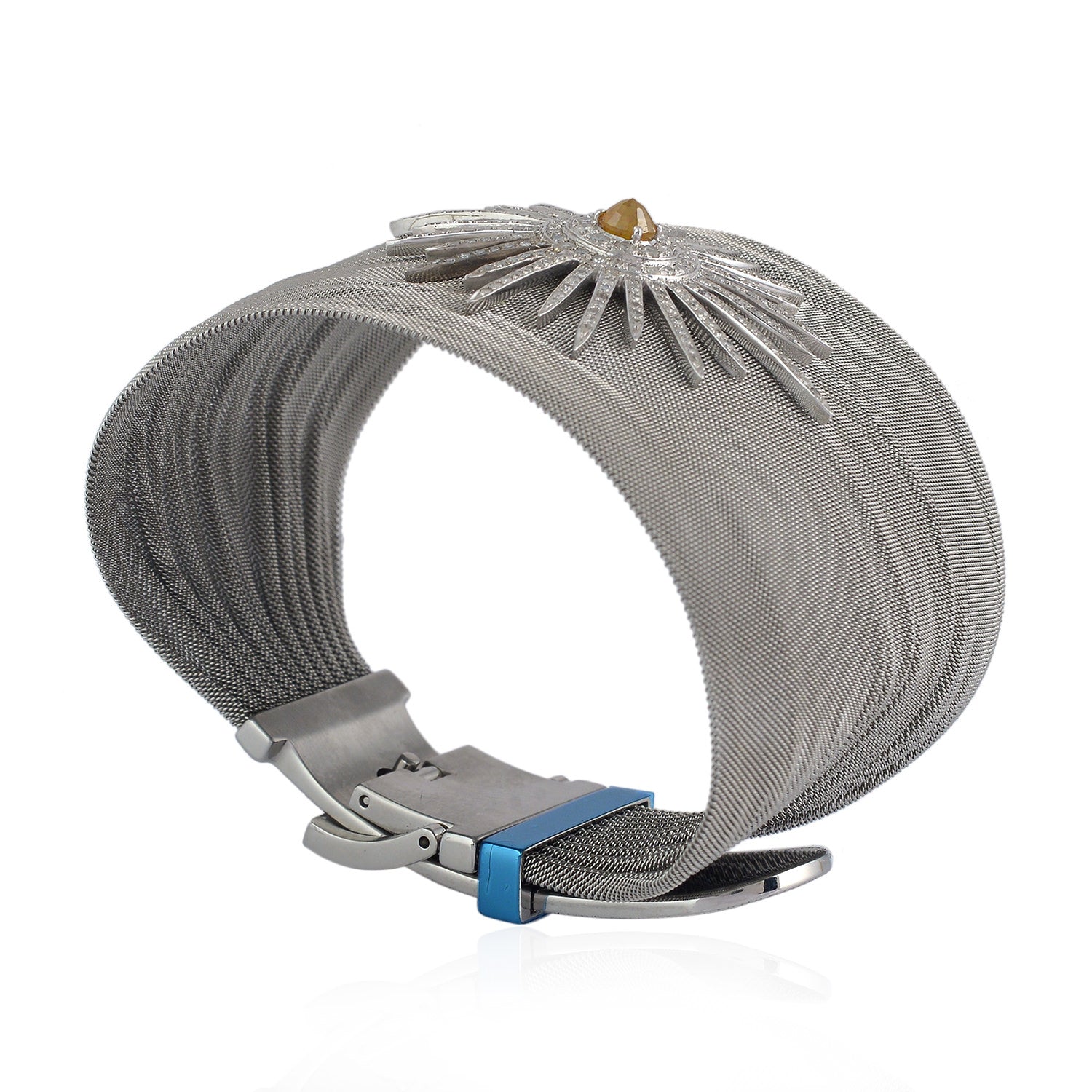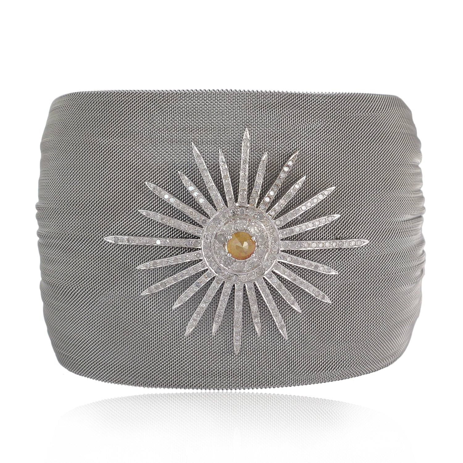 18K White Gold Steel Mesh Bangle with Pave Ice Diamond Starburst – Bold Luxury Statement