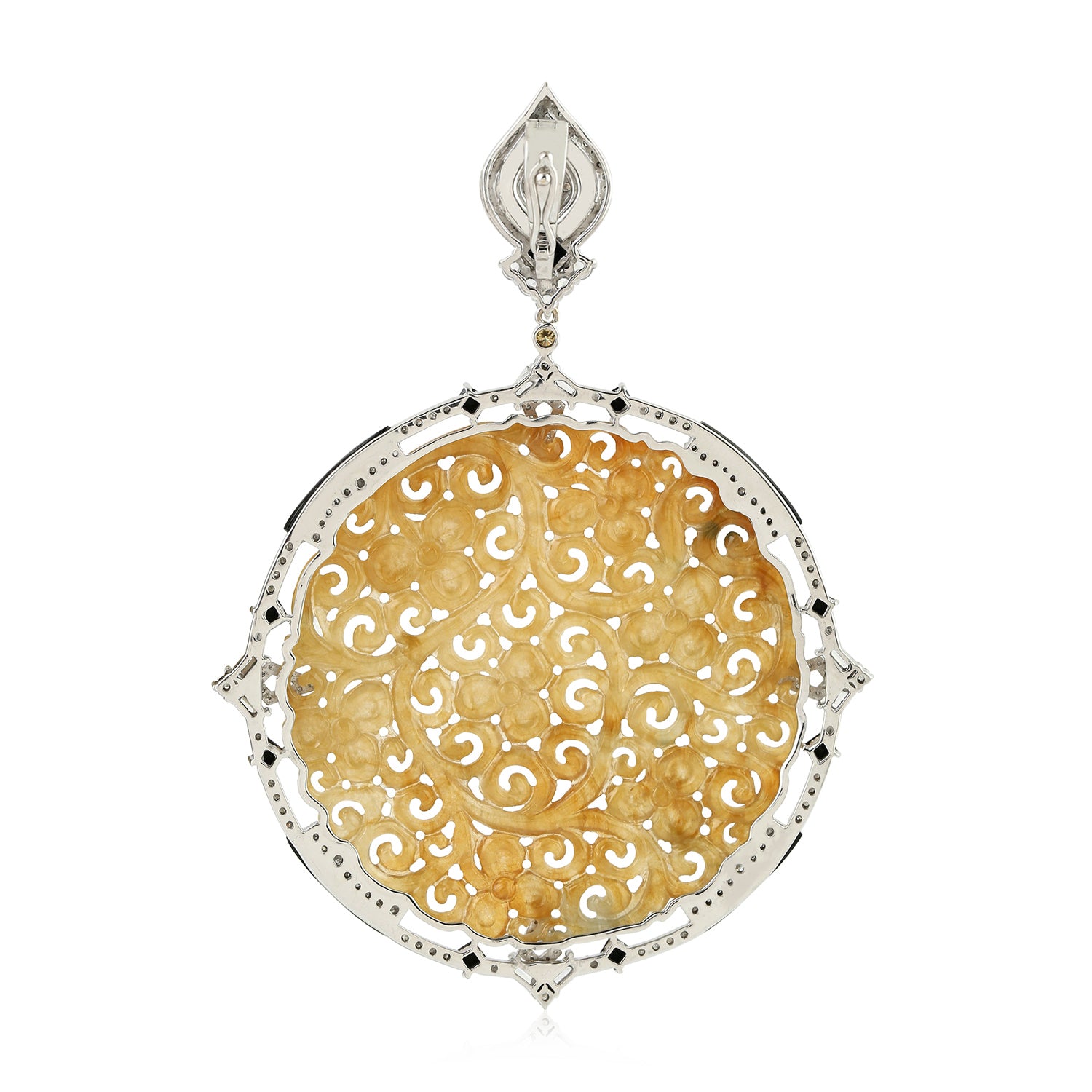 Carved Jade Medallion Pendant with Diamond, Onyx, Spinel & Sapphire in 18K White Gold & Silver