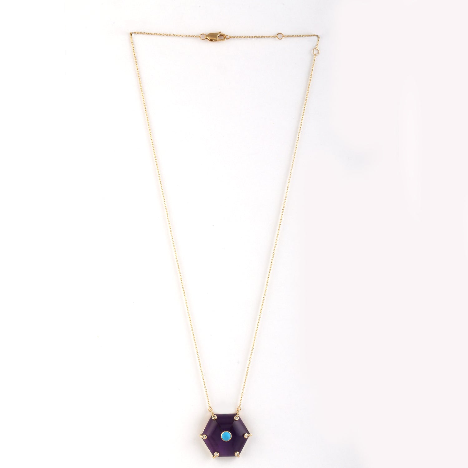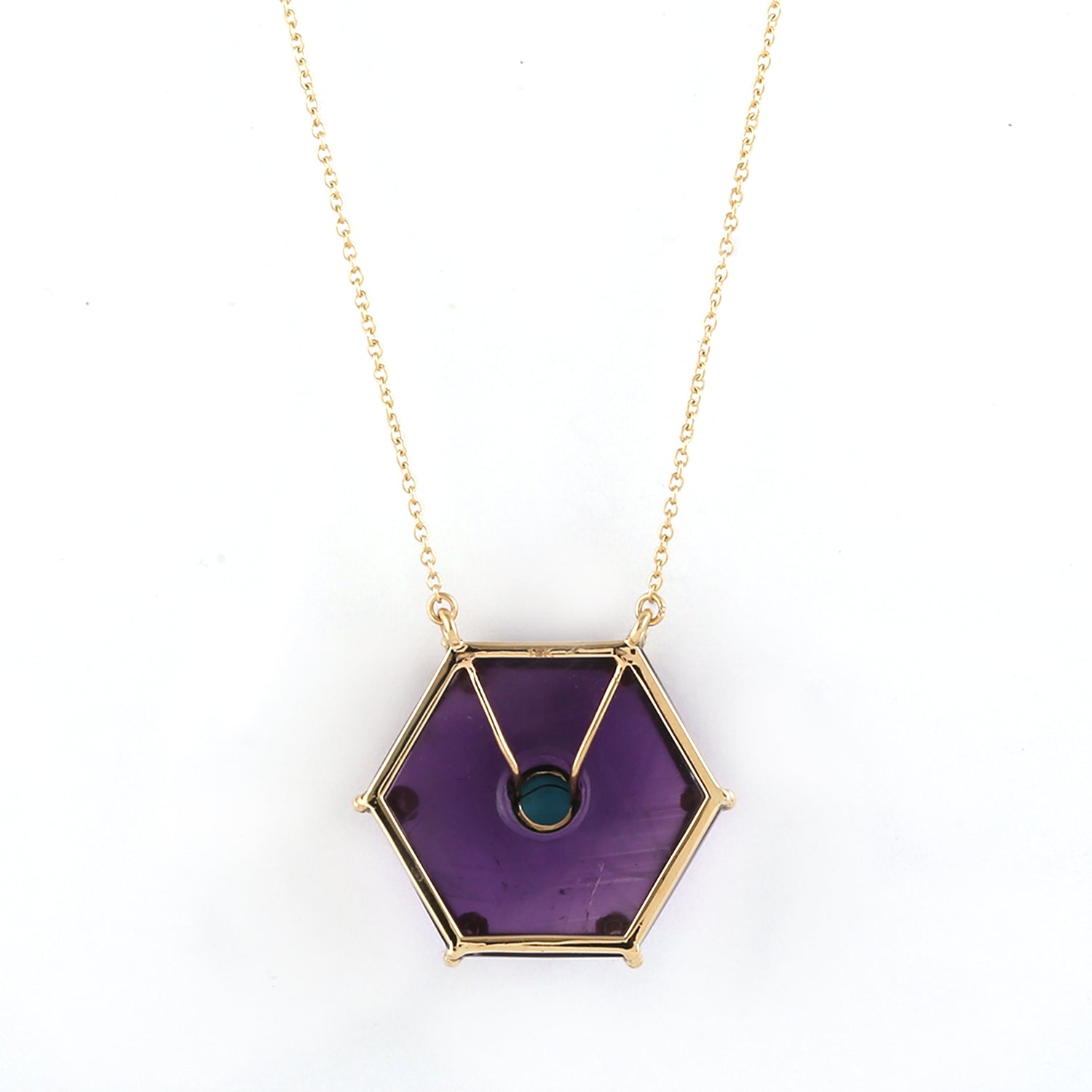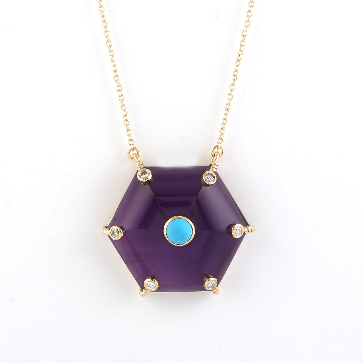 Hexagon Amethyst & Turquoise Pendant Necklace in 14K Yellow Gold