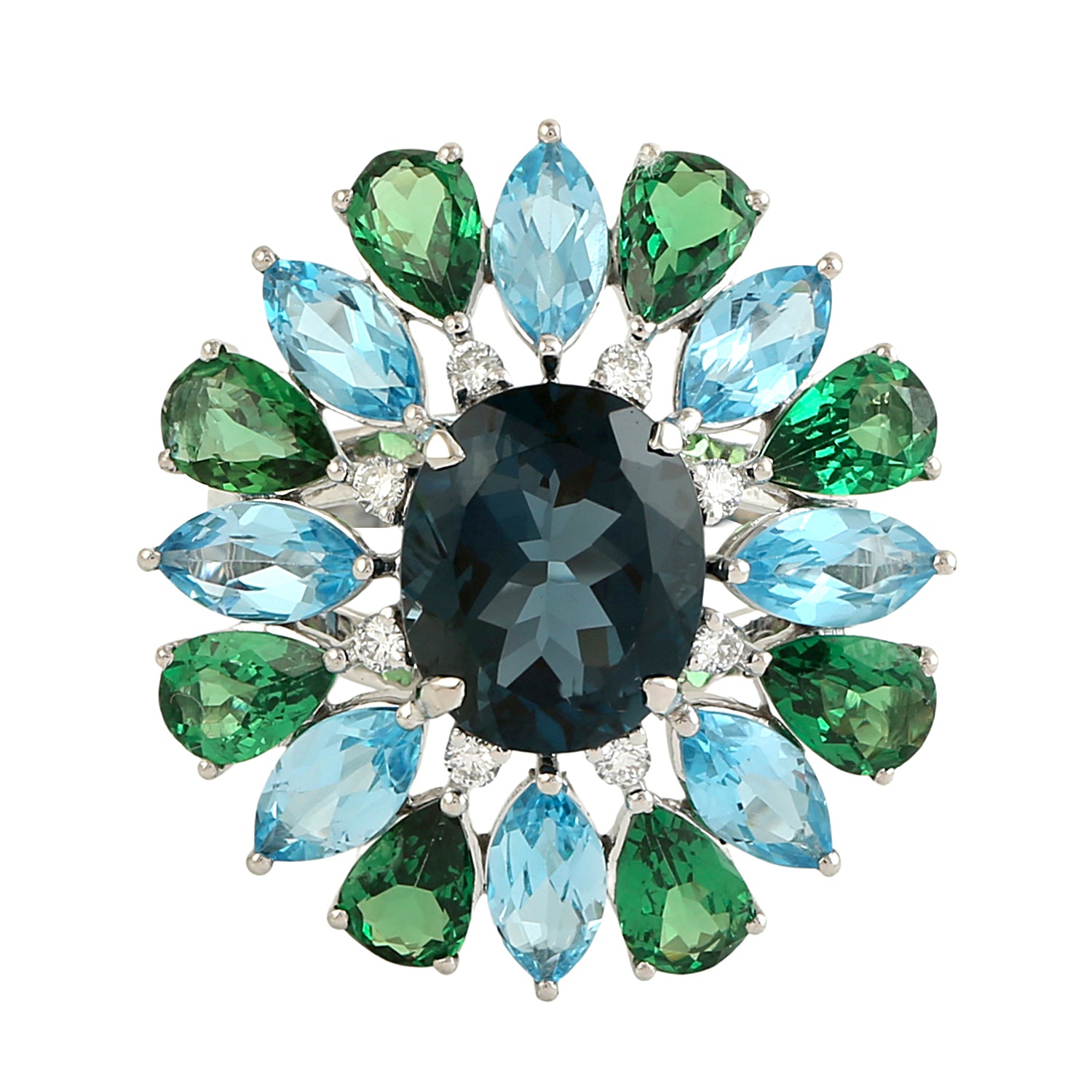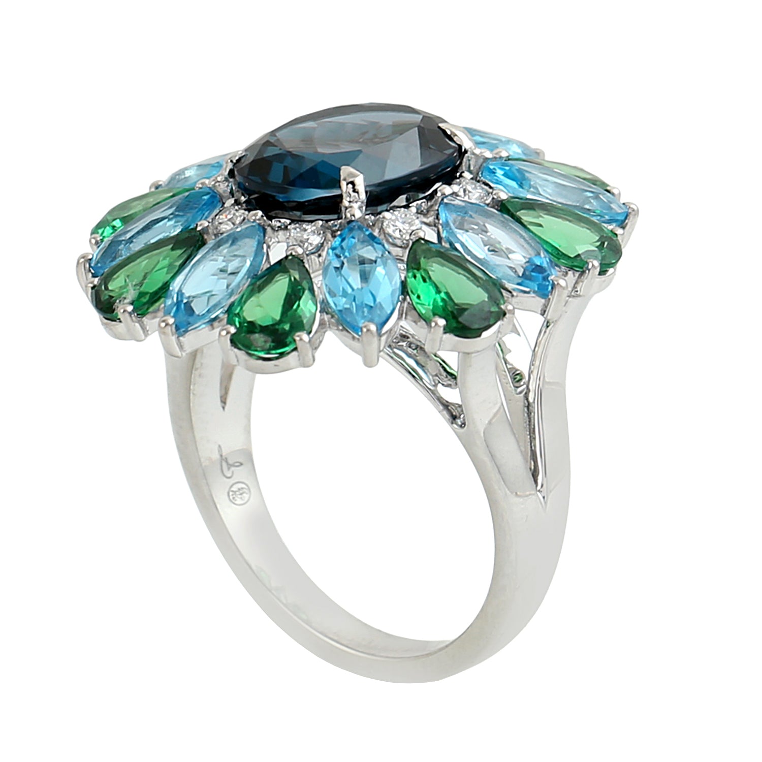 London Topaz, Tsavorite & Blue Topaz Prong Diamond Floral Cocktail Ring in 18K White Gold