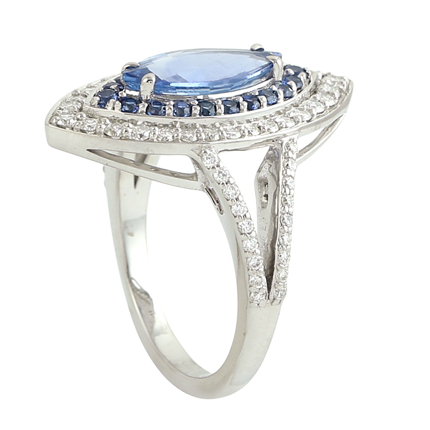 Marquise Cut Blue Sapphire & Diamond Double Halo Cocktail Ring in 14K White Gold