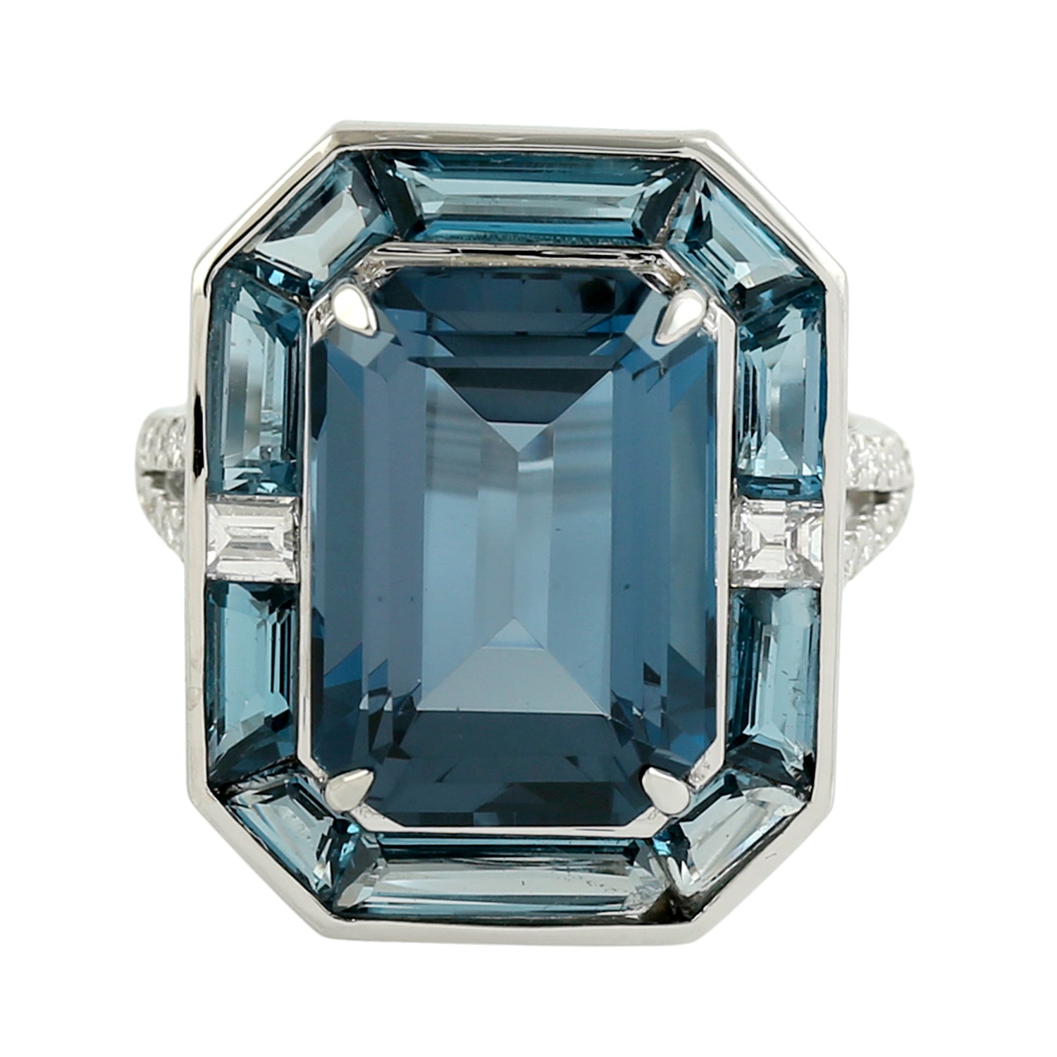 Octagon Cut London Blue Topaz Pave Diamond Cocktail Ring in 18K White Gold