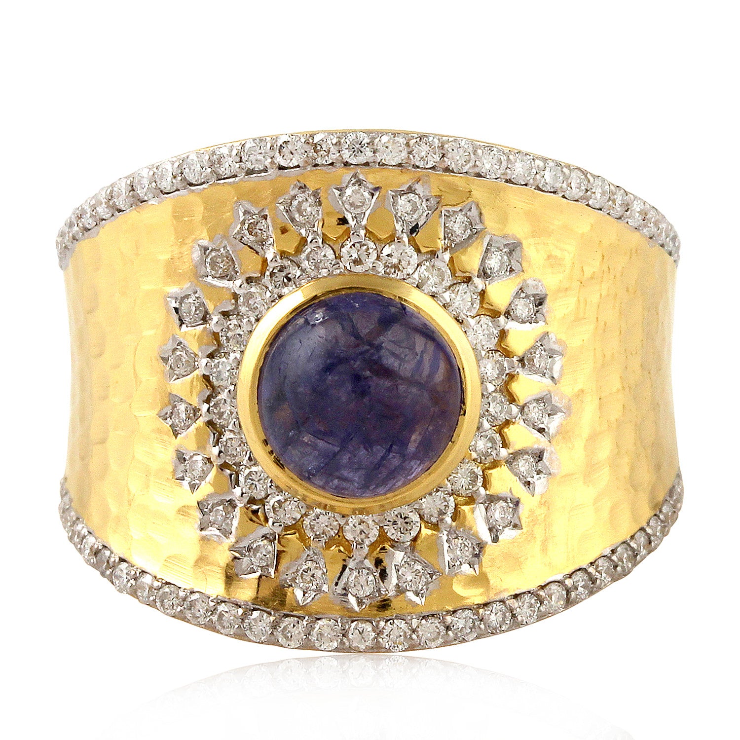 Tanzanite Gemstone Pave Diamond Designer Band Ring In 18K Yellow Gold