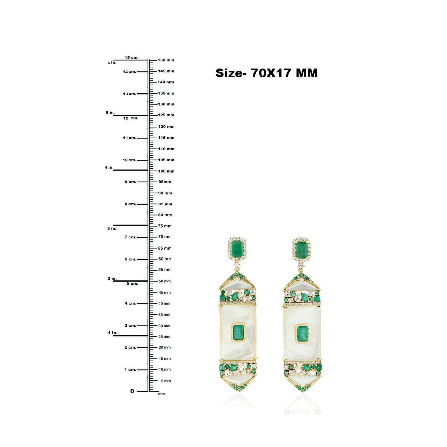 Mother of Pearl, Pear Cut Emerald & White Sapphire Danglers with Pave Diamonds in 18k Gold – Luxury Gemstone Earrings