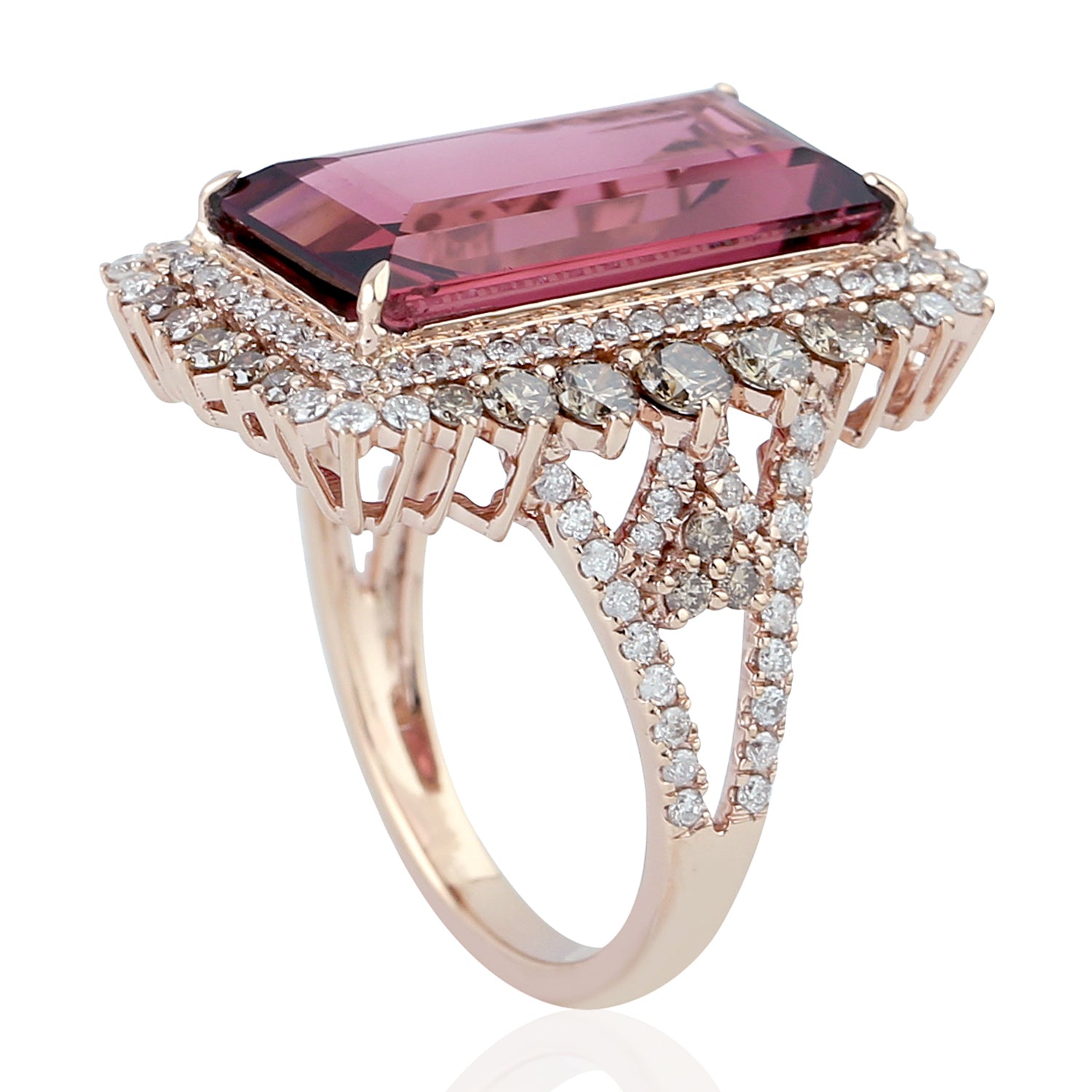 Baguette Cut Pink Tourmaline Long Ring in 18K Rose Gold with Pave Diamonds – Elegant Statement Jewelry