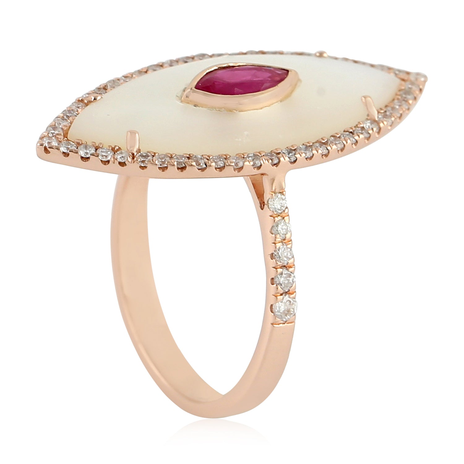 Mother of Pearl Bezel Ruby Pave Diamond Evil Eye Long Ring In Rose Gold