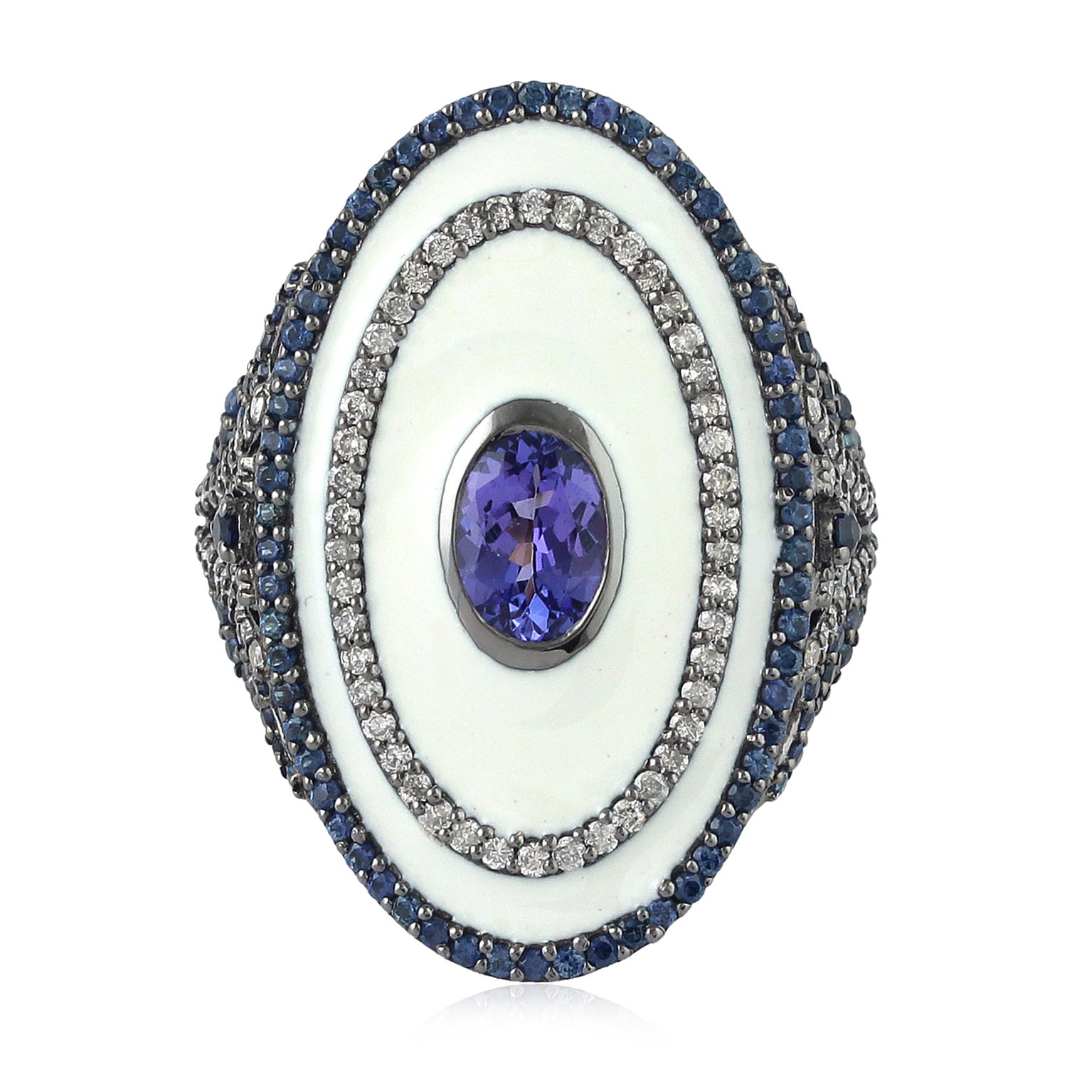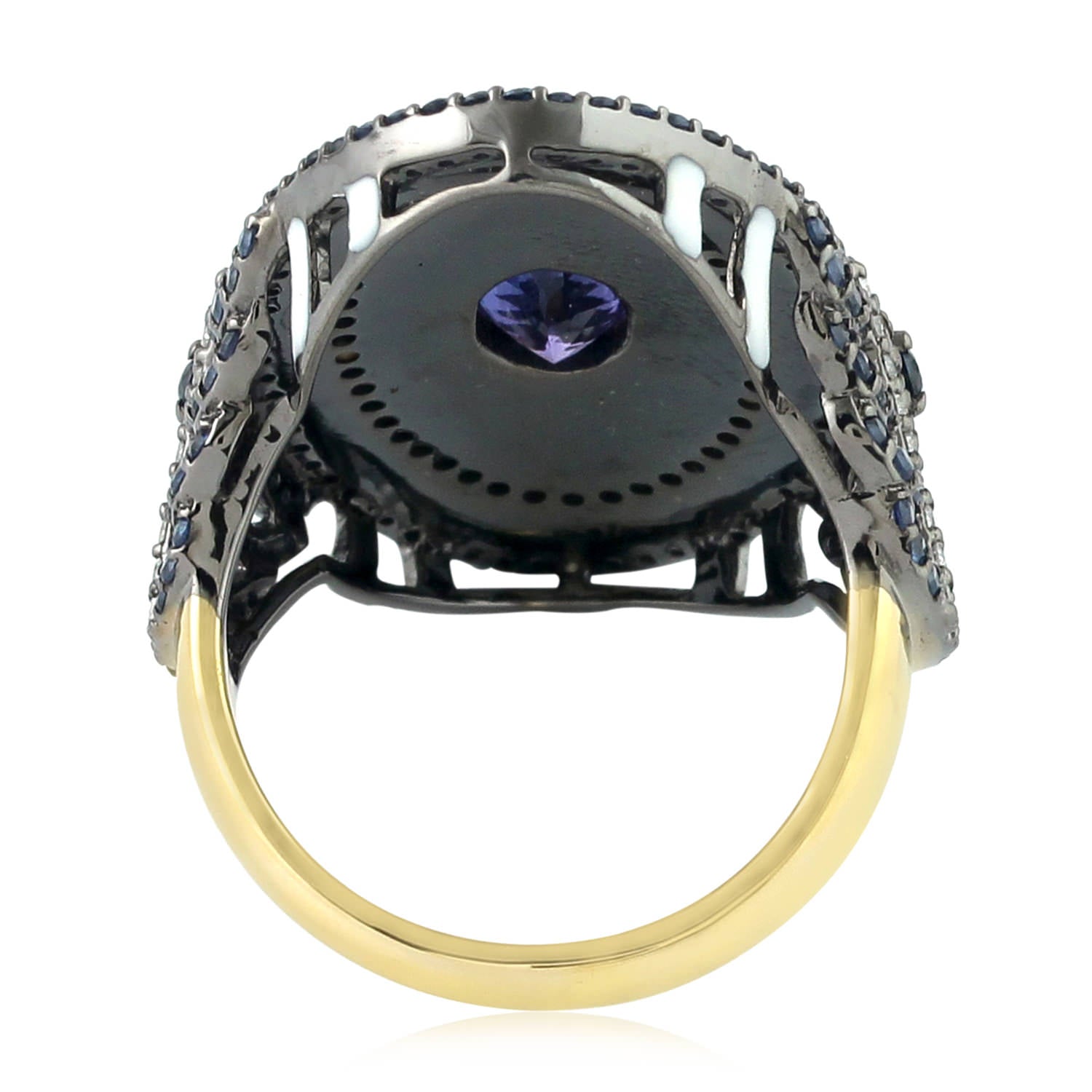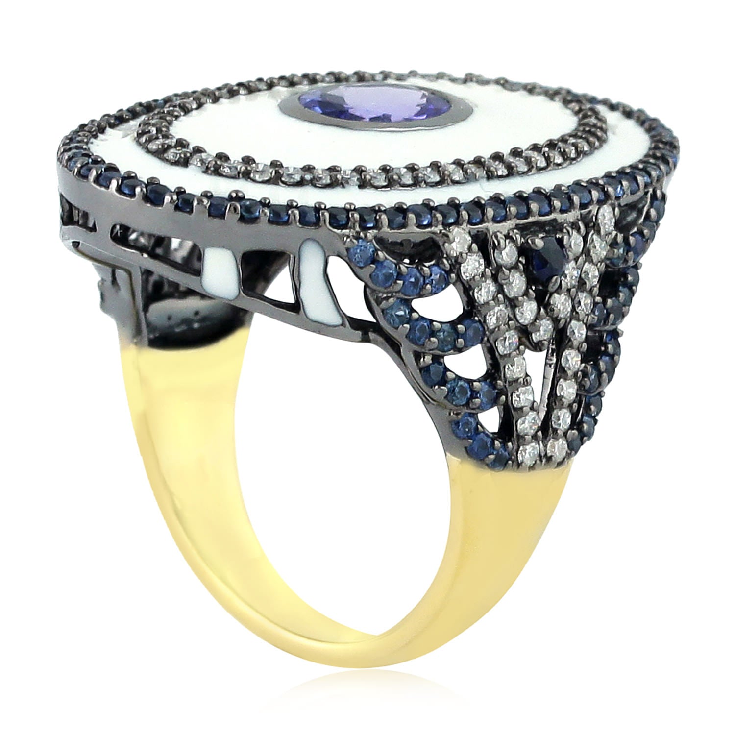 Tanzanite Pave Blue Sapphire Diamond Enamel Long Ring In Yellow Gold 925 Silver