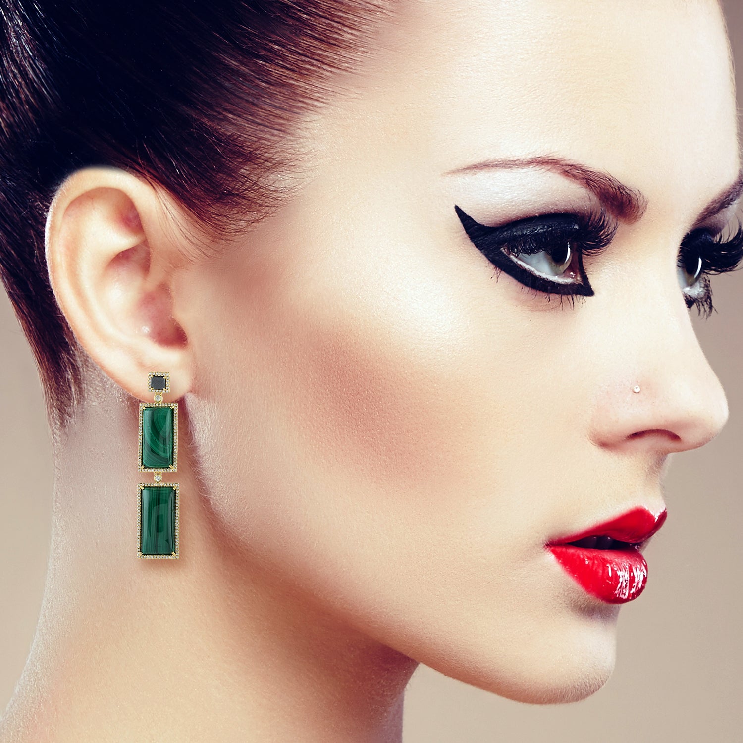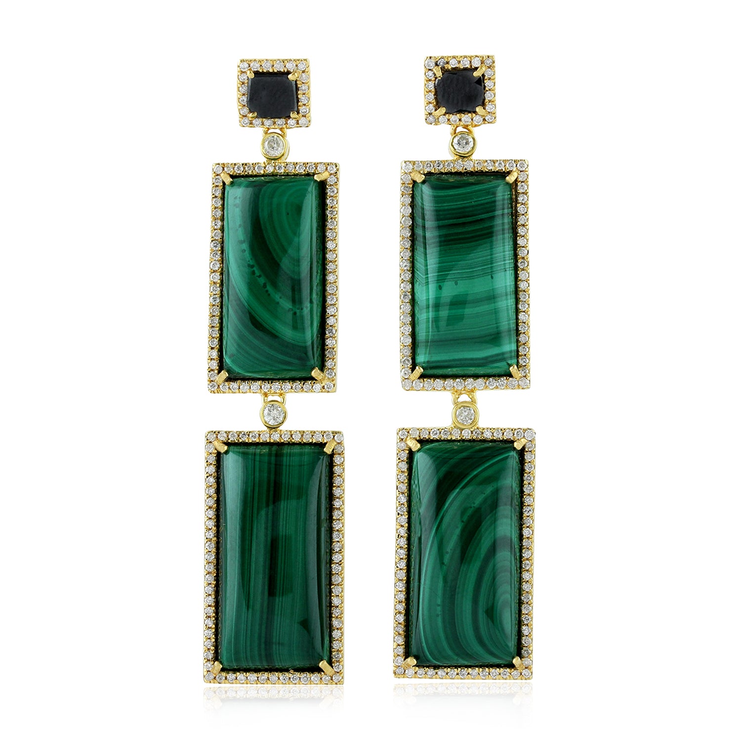 Baguette Cut Malachite Square Amethyst Pave Diamond Dangler In 18K Gold