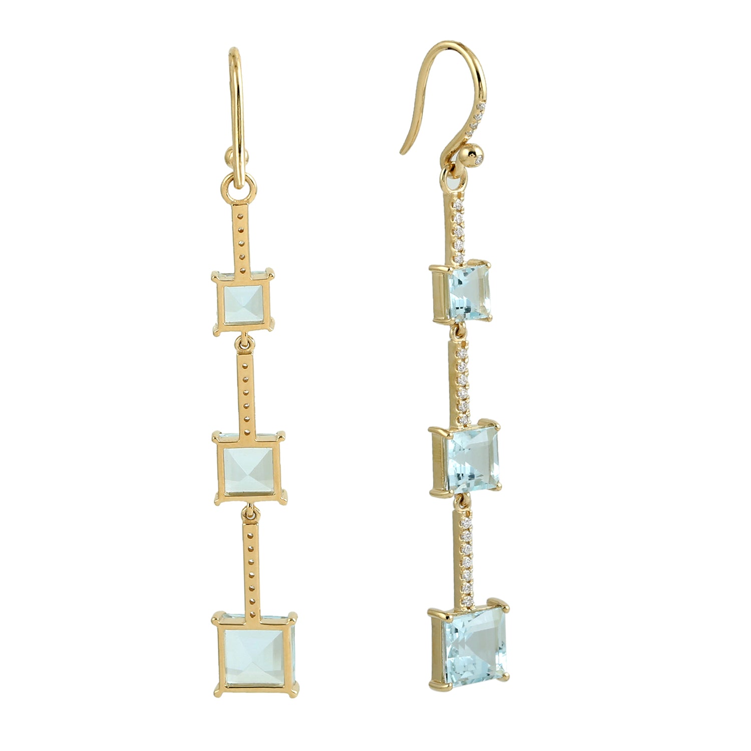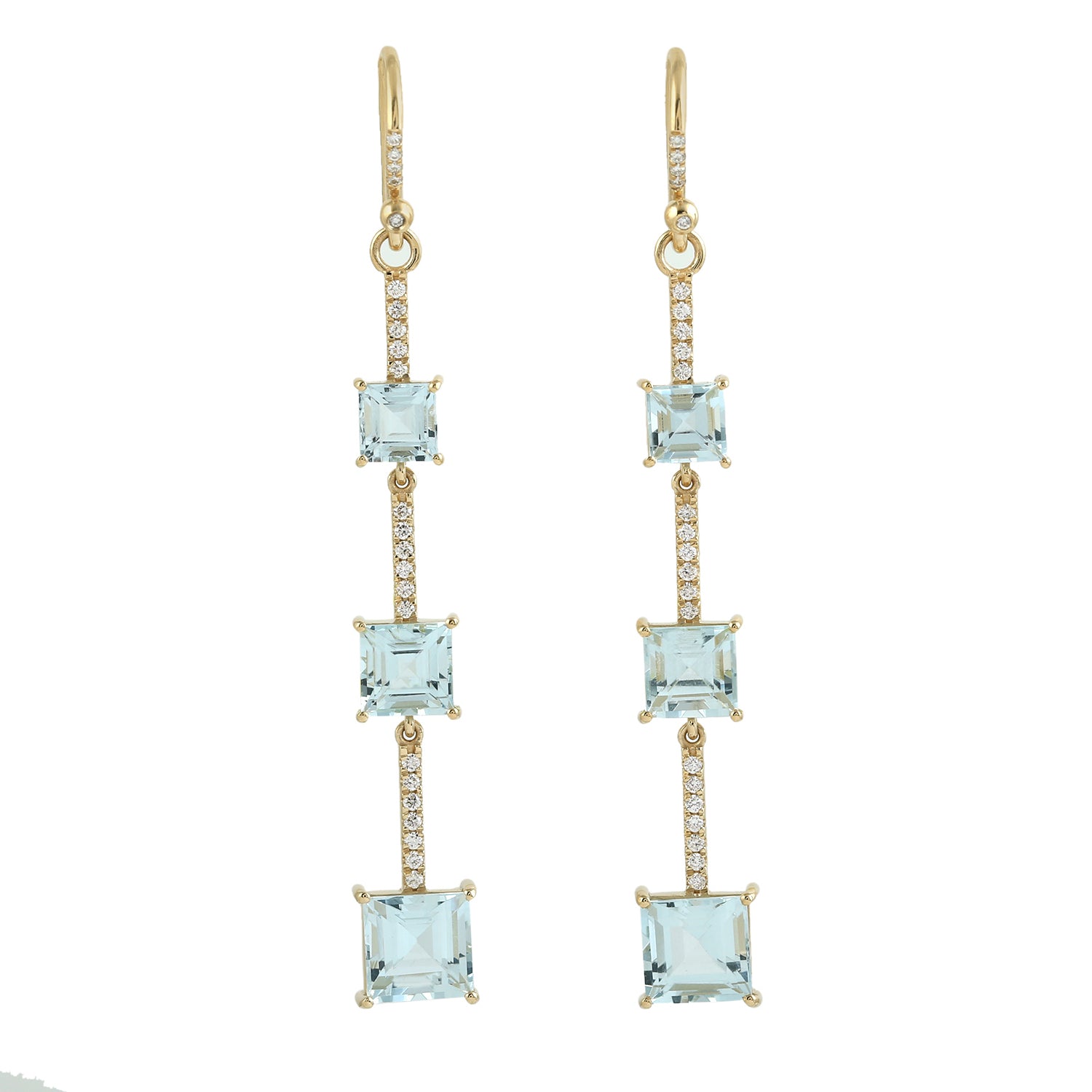 18K Yellow Gold Prong Square Cut Aquamarine Pave Diamond Wedding Dangler